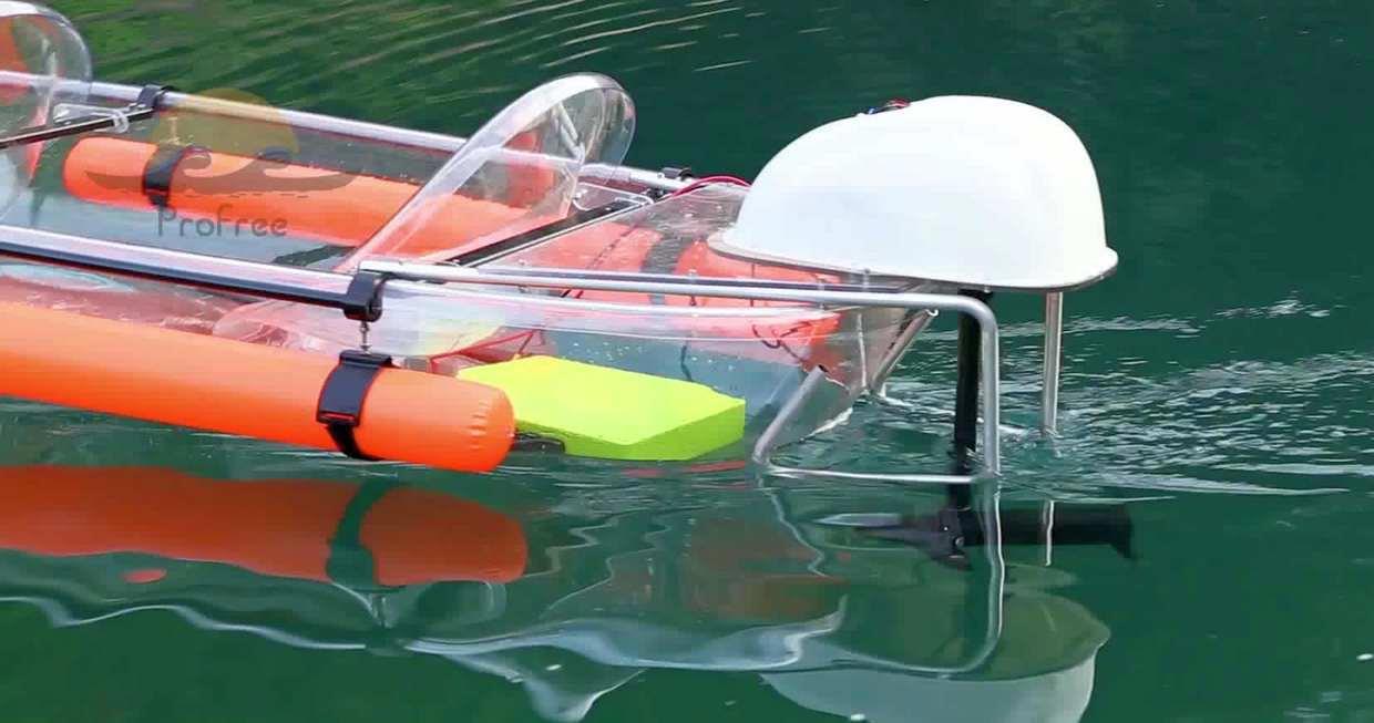 Мало того, если потребителю плавать на прозрачной лодке хочется, а вот грести совсем не хочется, то ему предложат вот такой маленький подвесной электромоторчик на корму:
