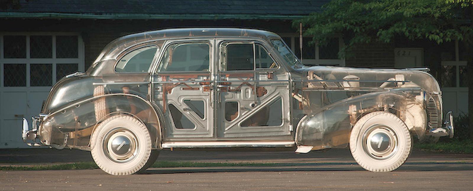 Ещё реже встречаются другие прозрачные изделия, но тоже встречаются. Например, прозрачные автомобили. Их тоже зачем-то иногда строят. Не могу уверенно сказать (просто не вёл специальной статистики), но, если не первый, то один из первых прозрачных автомобилей был сделан в США, в 1939 году. Называлась эта модель Pontiac Ghost Car. Вот он: