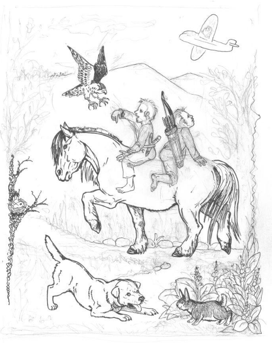 Вот они, на кобылке, с ручным соколом и с сучкой лабрадора, весело играющей с кроликом.