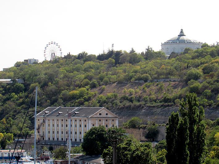 А вот и собрат плавучего дока- только в затопленном состоянии. Представляю- когда они примут корабль и всплывут- сколько там у них будет рыбы... Вид на Панораму, чёртово колесо и Холодильник (он внизу)
