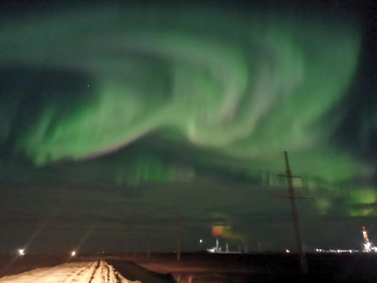Автор: Евгений КрасДа, снимки сделаны телефоном, поэтому качество "не очень", но здесь важно само событие. Говорят, что такой магнитной бури не было просто чёрт знает сколько лет. Поэтому на Севере небо полыхнуло. Ямало-Ненецкий автономный округ. Две речки называются Мессояха... где-то там: