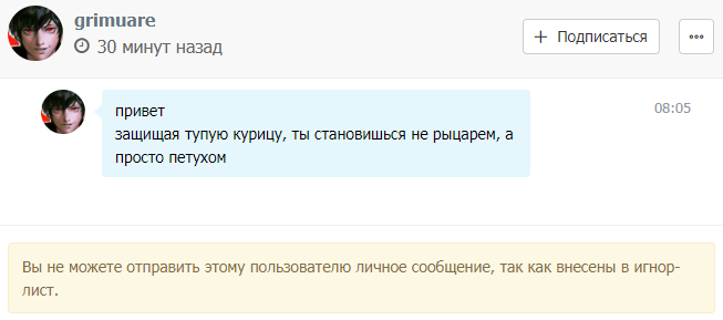 Автор: Серый МышСегодня получил просто восхитительное личное сообщение от малолетнего дрочилы молодого, но талантливого автора, считающего себя успешным писателем. При этом товарищ поудалял все комментарии и анально отгородился по всем фронтам, чтобы я не имел возможности пояснить ему, в чём он неправ. Всего-навсего в вежливой форме указал ему на недопустимость грубить и хамить всем подряд и изображать из себя Д`Артаньяна, окружённого педер@стами.