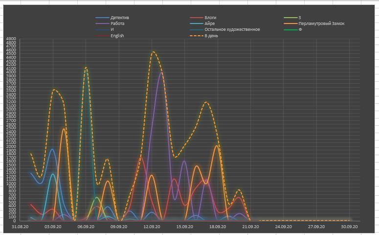 Среднее по слов/день за весь месяц — 1212, если выбросить выпавшие дни, то 1818.