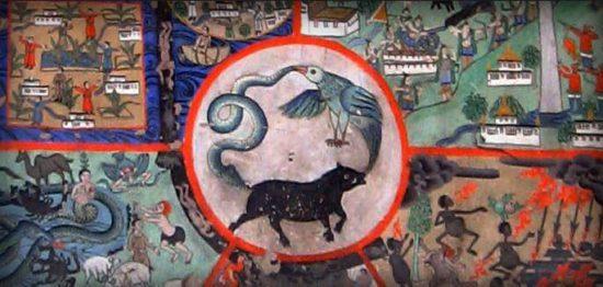 Чудовище держащее круг — это Бог Смерти, сам круг — все миры сансары (обусловленного существования). Все это значит, что в сансаре никто не свободен от страданий рождения, болезни, старости и смерти. Все миры в когтистых лапах Бога Смерти!