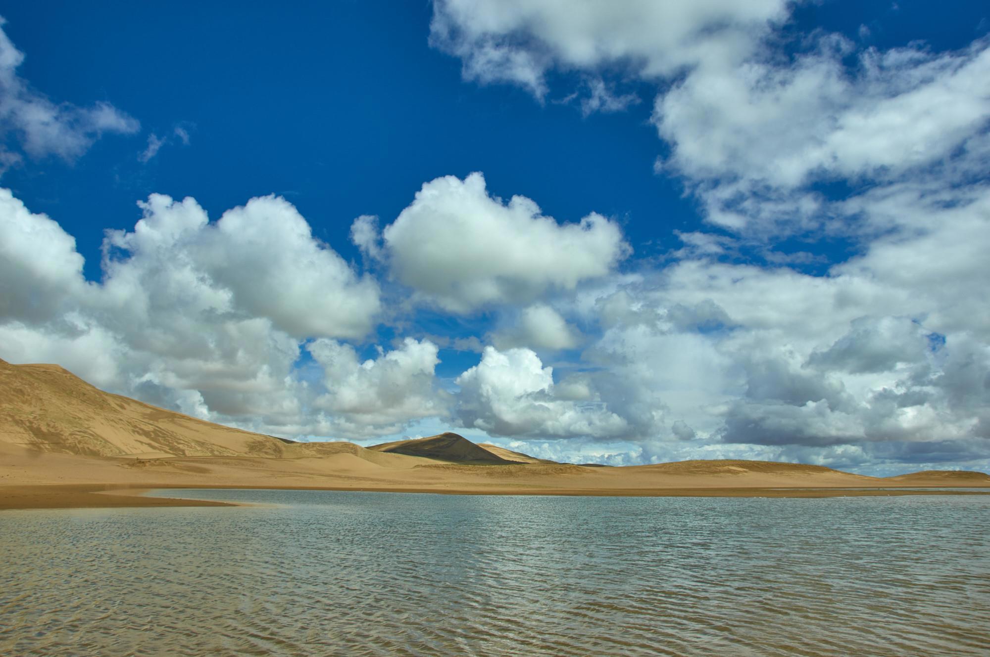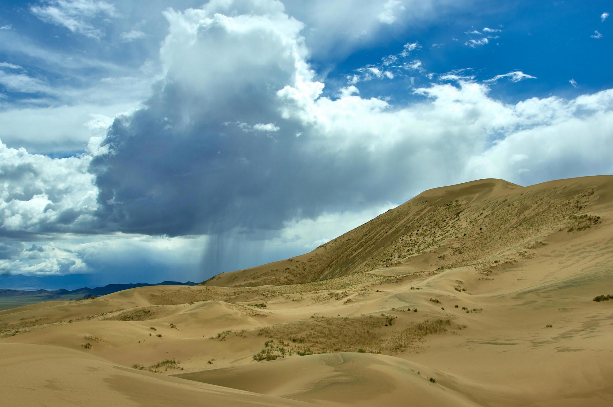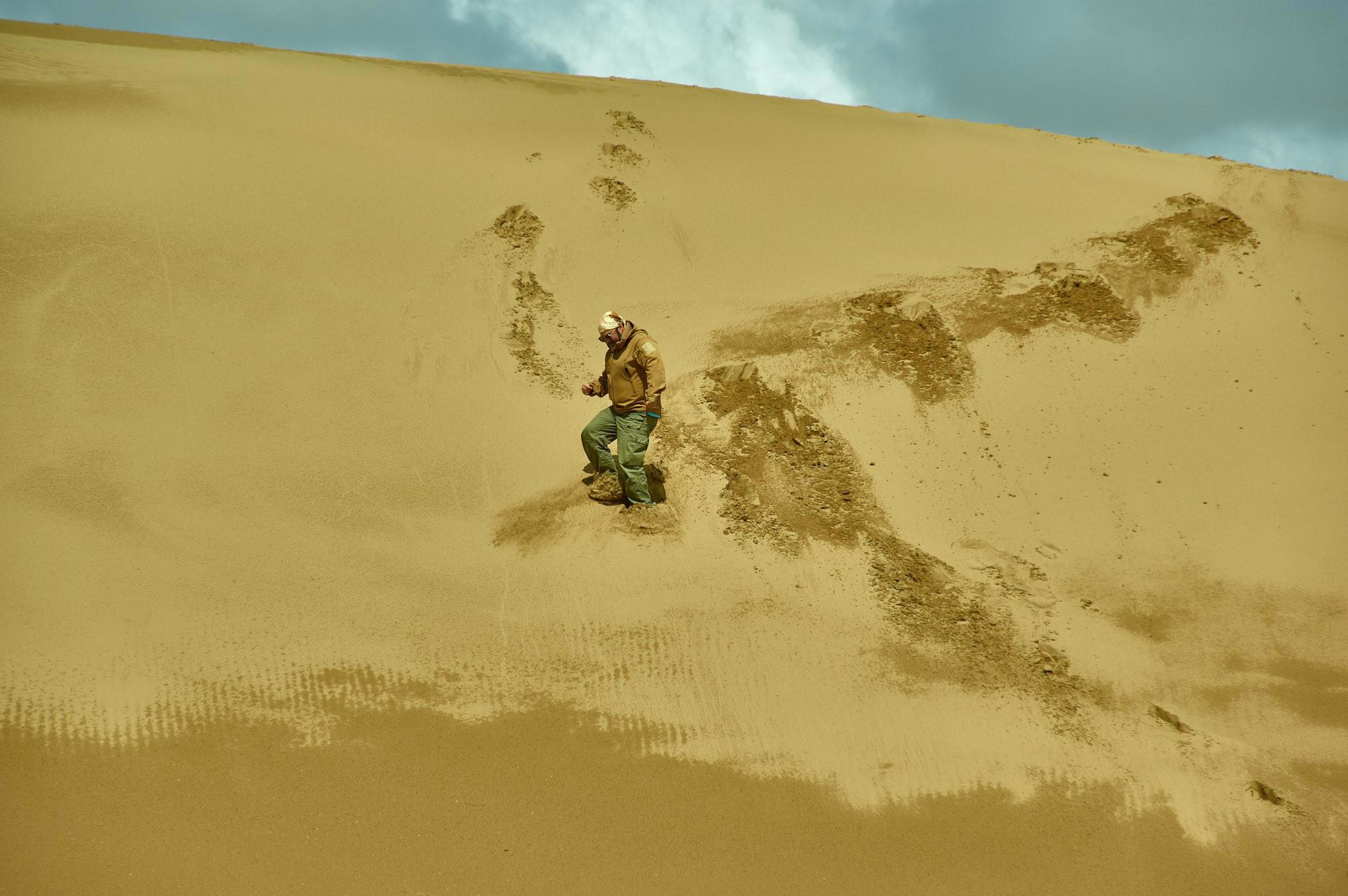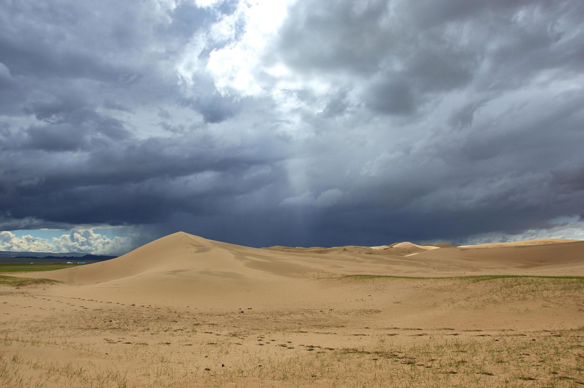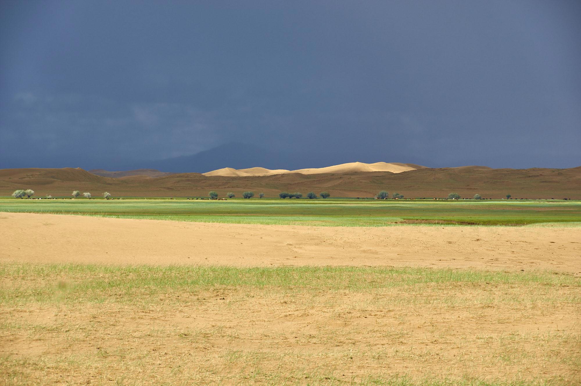 Погода между тем продолжает хмуриться. По небу несутся набрякшие водой тучи. Полный сюр! Промокнуть от ливня на песчаных барханах! Обычно ведь они у нас ассоциируются с ярким и безжалостным солнцем и бесконечным ясным небом. Здесь же облака чуть ли не цепляют землю. Хорошо хоть на сухом воздухе можно быстро высохнуть.