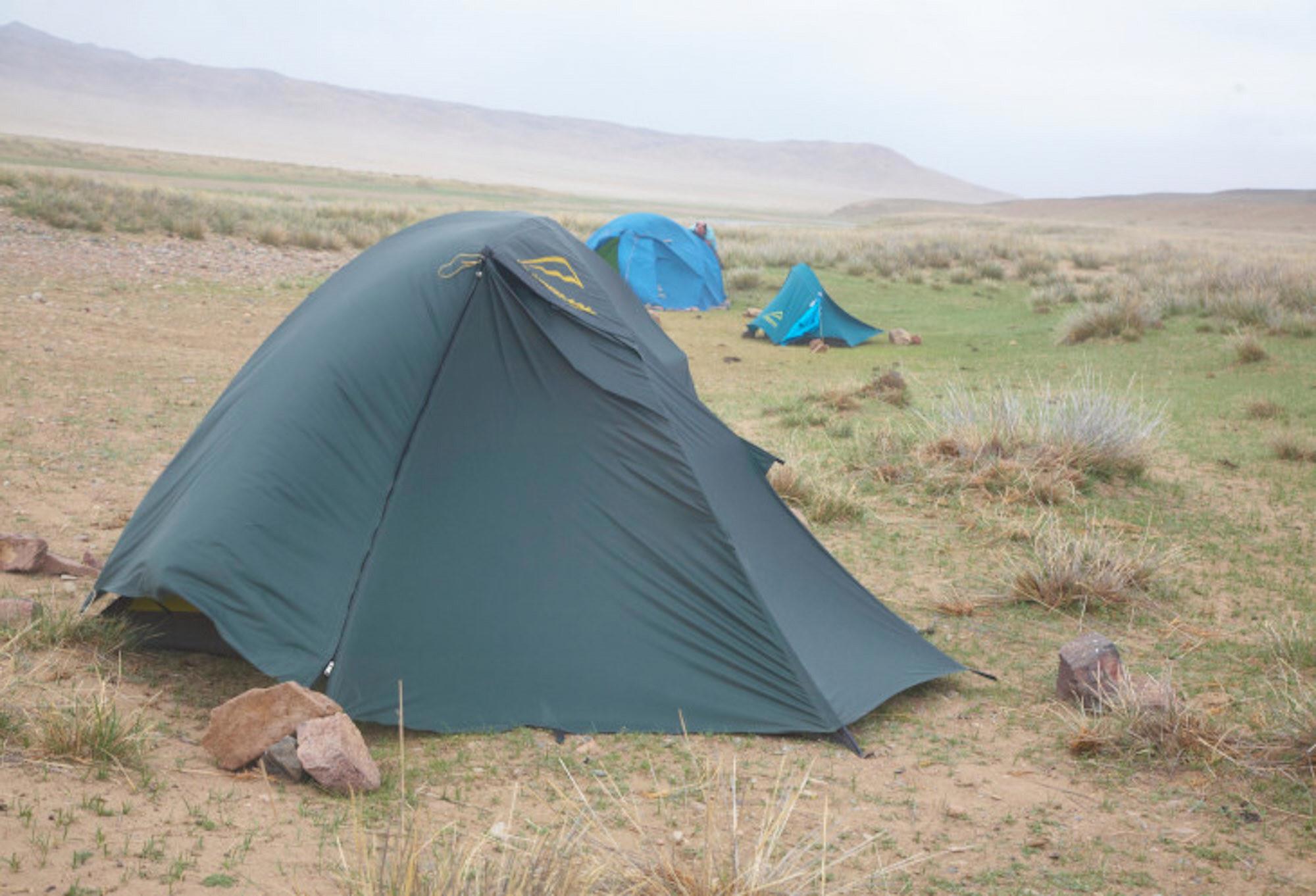 Природа оказалась жесткой и к нам. Этот день прошел непримечательно, погода с утра резко испортилась, мы так и остались на месте.  Ехать дальше посчитали бессмысленным, считая, что эта непогодь на несколько часов. Ну и просчитались… В итоге потеряли целый день. В один из моментов налетела песчаная буря. Вот снимок, я на заднем плане дополнительно укрепляю палатку камнями. А вот у коллеги жутким порывом чуть не снесло палатку напрочь, еле поймали.
