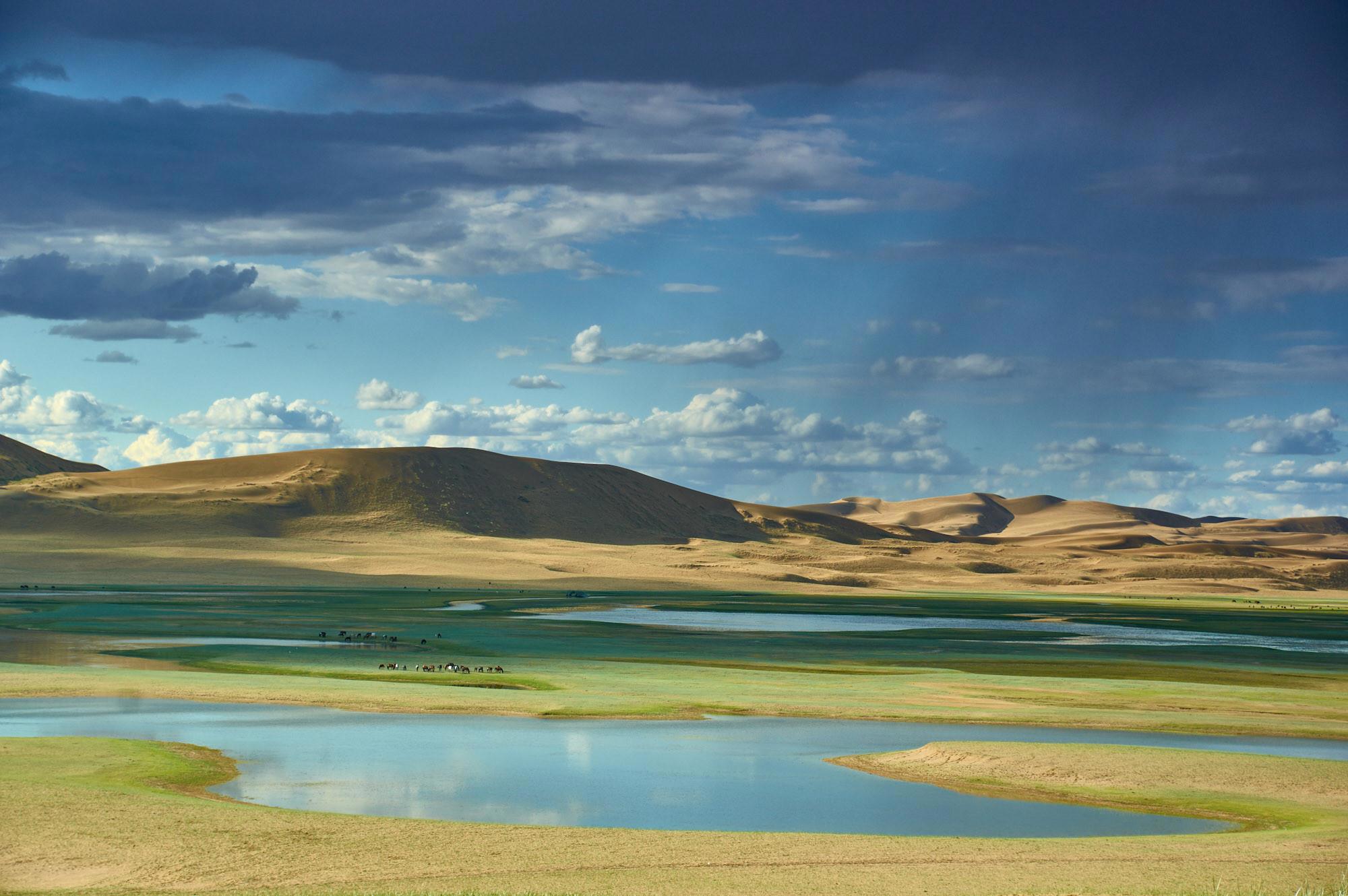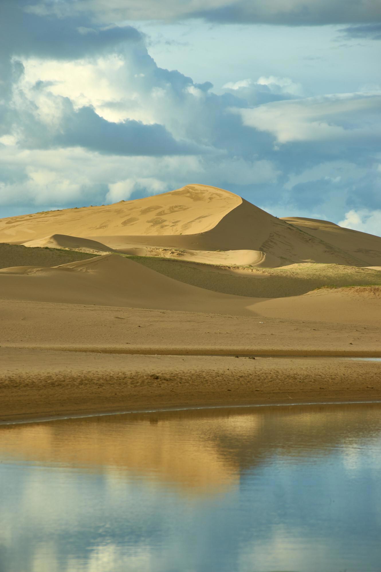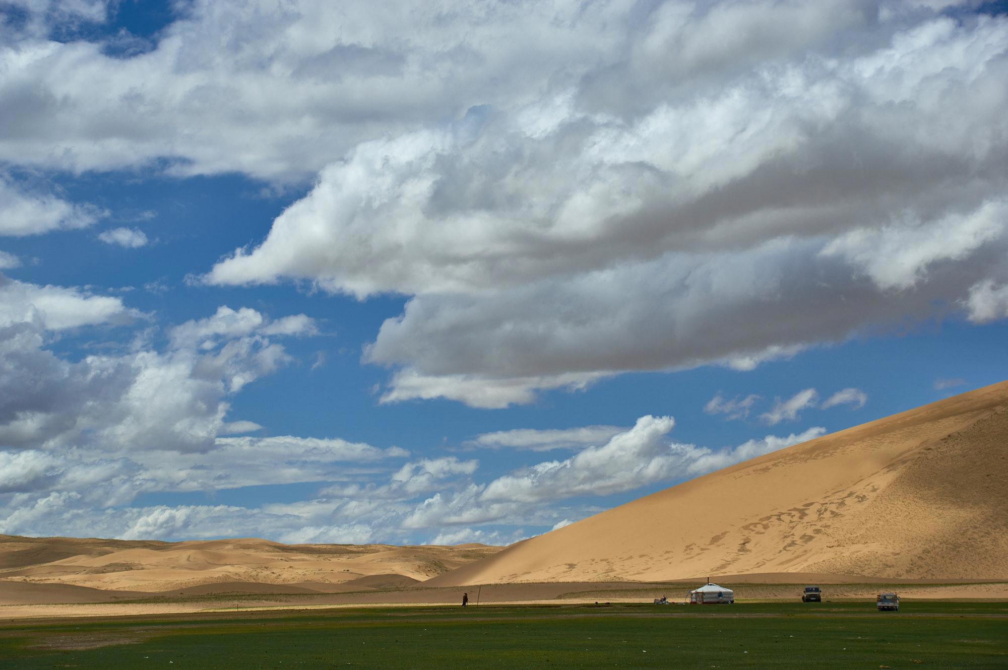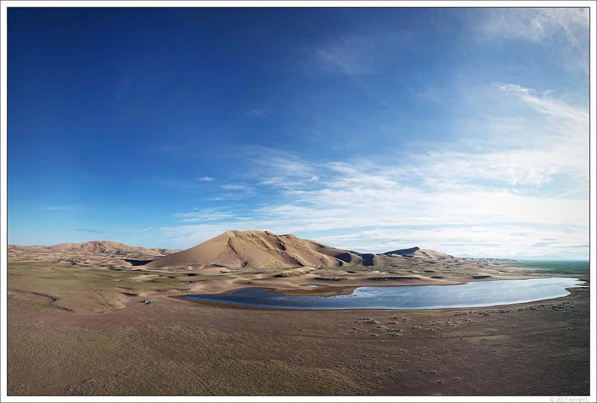 Вот, наконец, замечаем искомые дюны и радостно направляемся прямо к ним. Благо путей дорожек хватает. Поначалу мы хотим поставить лагерь неподалёку от озера Эрэен-Нуур, которое расположено посреди песков. Но именно туда на автомобиле не проехать, разбиваемся неподалеку от реки, перекусываем и отправляемся гулять по барханам. В целом картина несказанно завораживает, ярко-зеленые луга подходят прямо к пескам. И это не какие-то там мелкие песчаники, а настоящие горы из песка! Много гэров, пасутся козы и овцы. Милая сердцу пастораль.