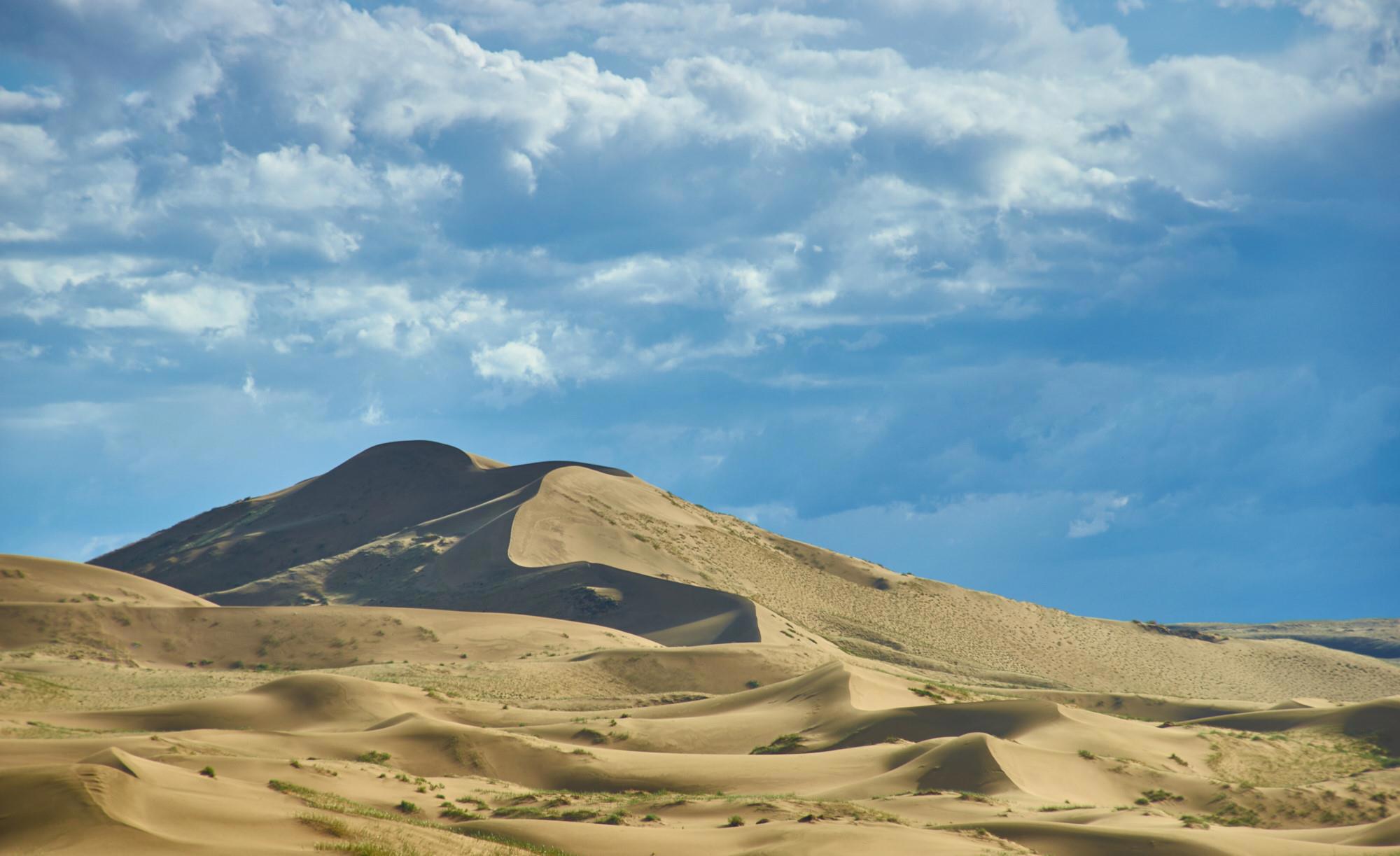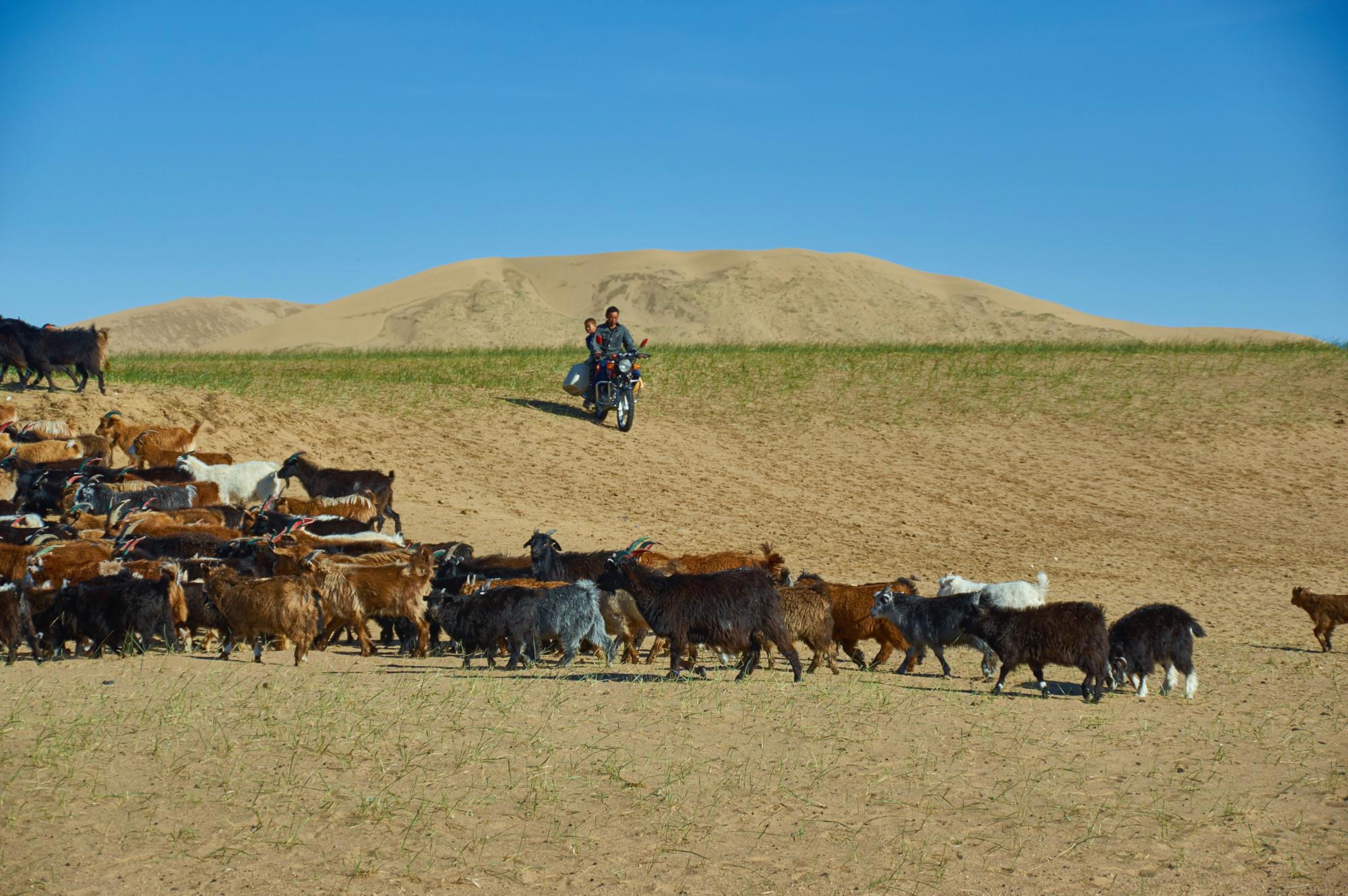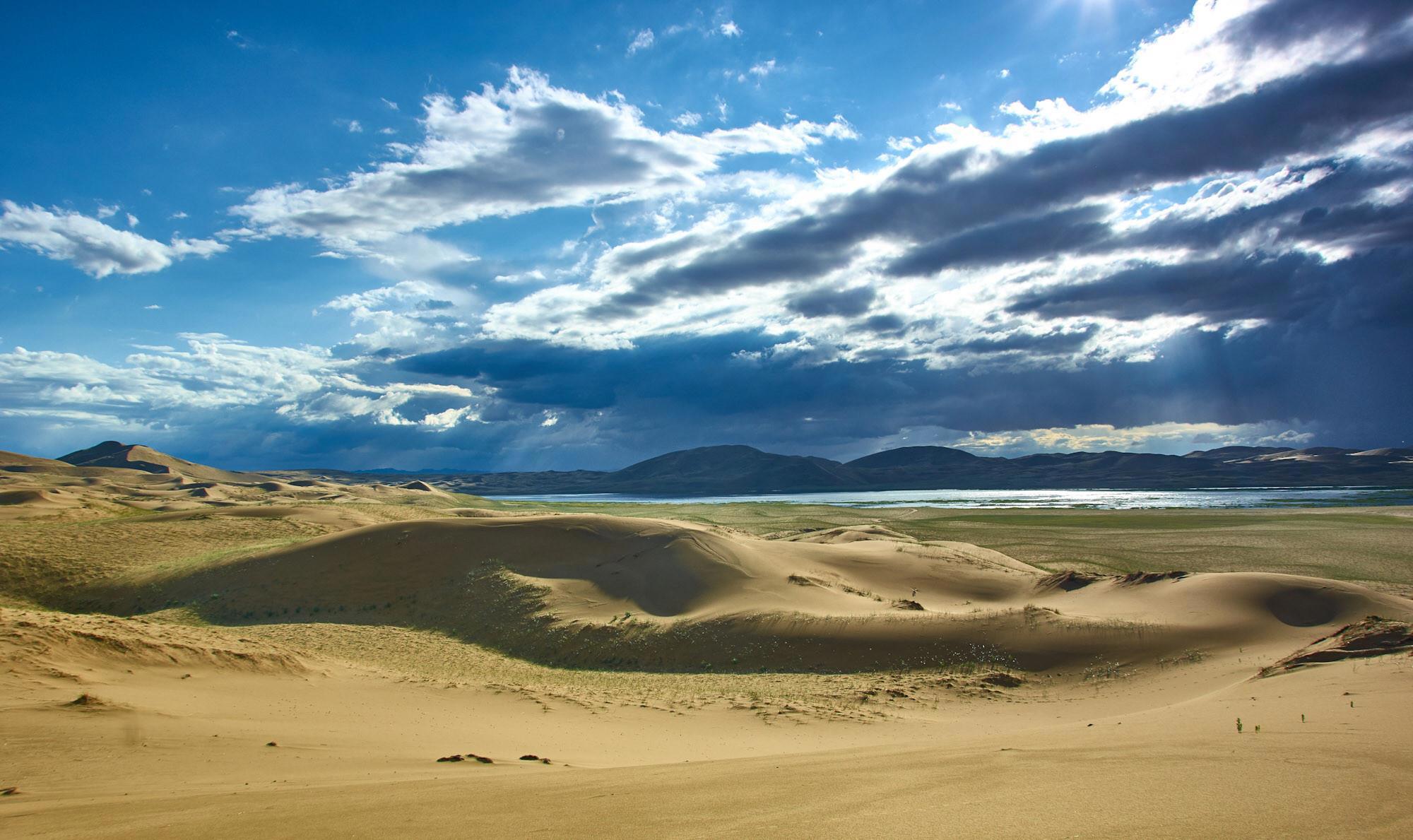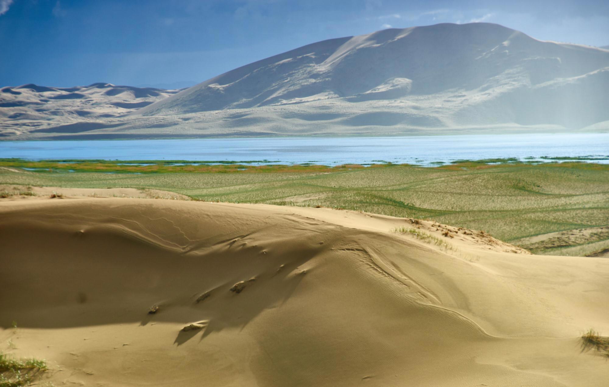 Вот, наконец, замечаем искомые дюны и радостно направляемся прямо к ним. Благо путей дорожек хватает. Поначалу мы хотим поставить лагерь неподалёку от озера Эрэен-Нуур, которое расположено посреди песков. Но именно туда на автомобиле не проехать, разбиваемся неподалеку от реки, перекусываем и отправляемся гулять по барханам. В целом картина несказанно завораживает, ярко-зеленые луга подходят прямо к пескам. И это не какие-то там мелкие песчаники, а настоящие горы из песка! Много гэров, пасутся козы и овцы. Милая сердцу пастораль.