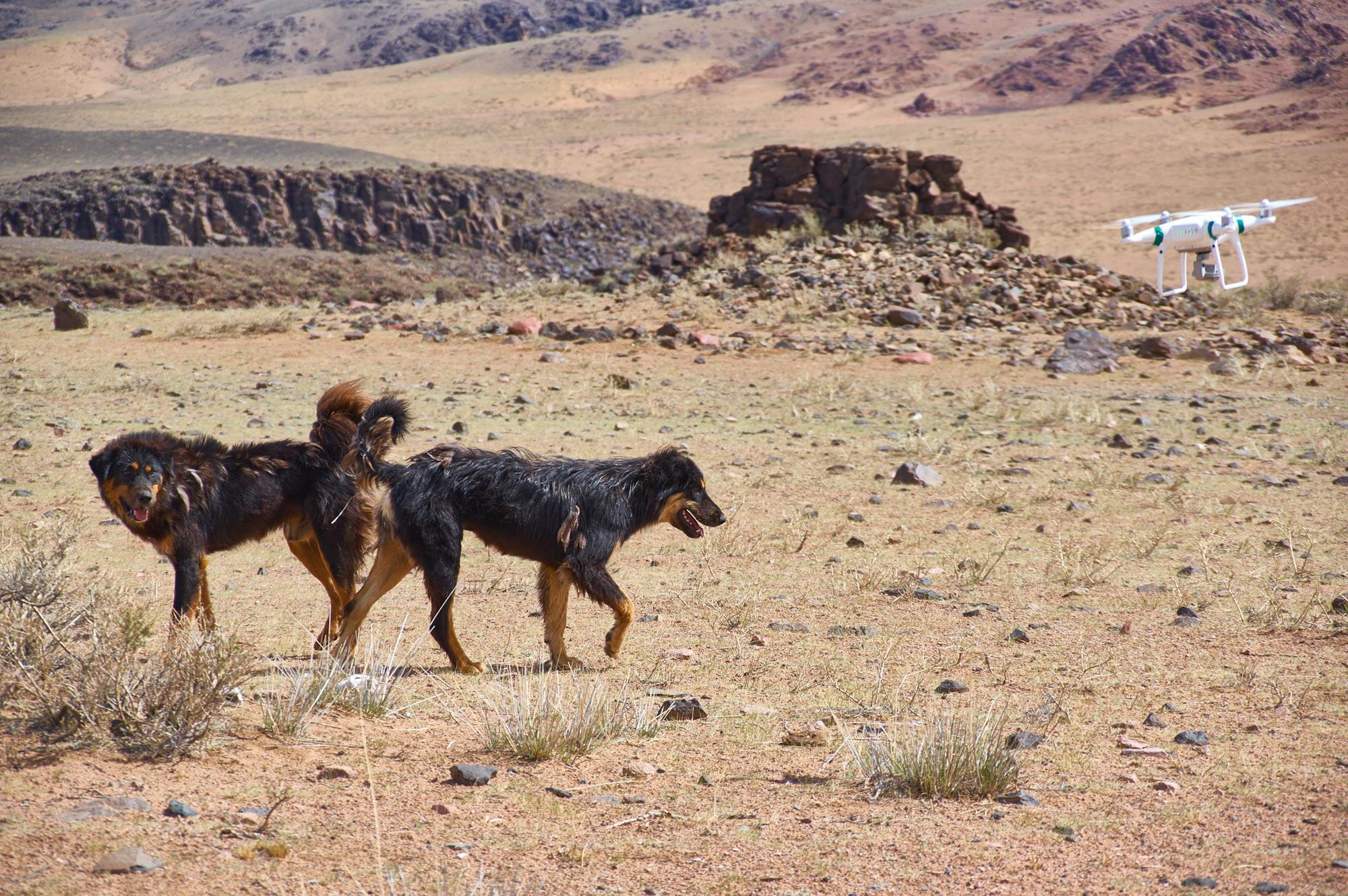 А вот расстилающийся после каньона каменистый пейзаж поражает своей необычностью. Выходы на поверхность черного базальта, багряный оттенок каменистой пустыни. Вид поистине завораживает. К нам неожиданно приближаются местные собачки, с любопытством реагируя на летающий коптер. Лепота!