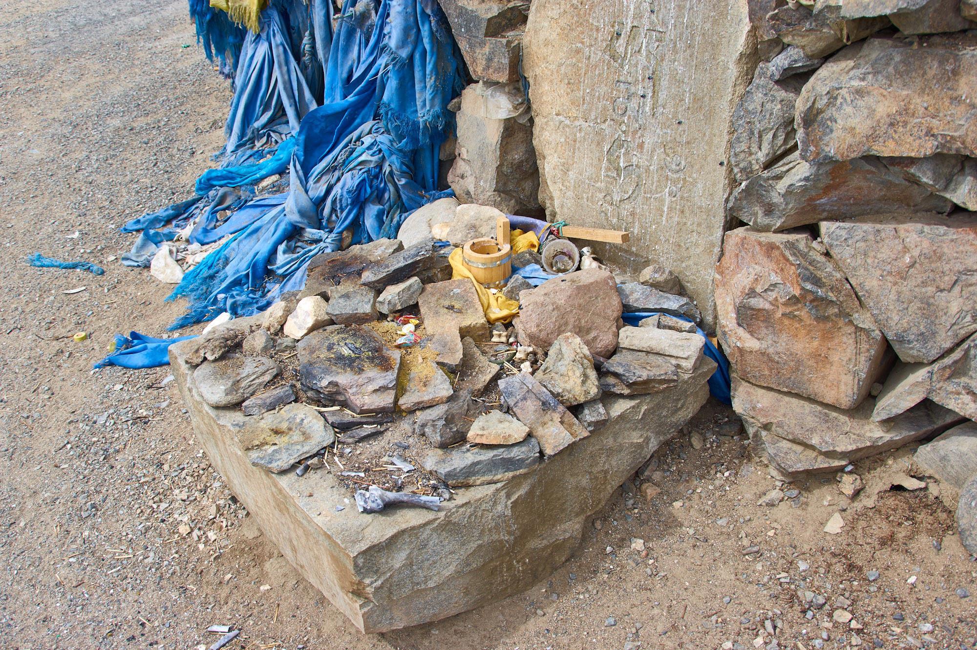 Затем мы наблюдали в Монголии множество Обо, которые часто ставят на перевалах. Многие монголы оставляют на пирамидах жертвенные предметы, почему-то мы видели большое количество костылей. Частенько можно заметить следы возлияний, льют мясной бульон или капают жиром.