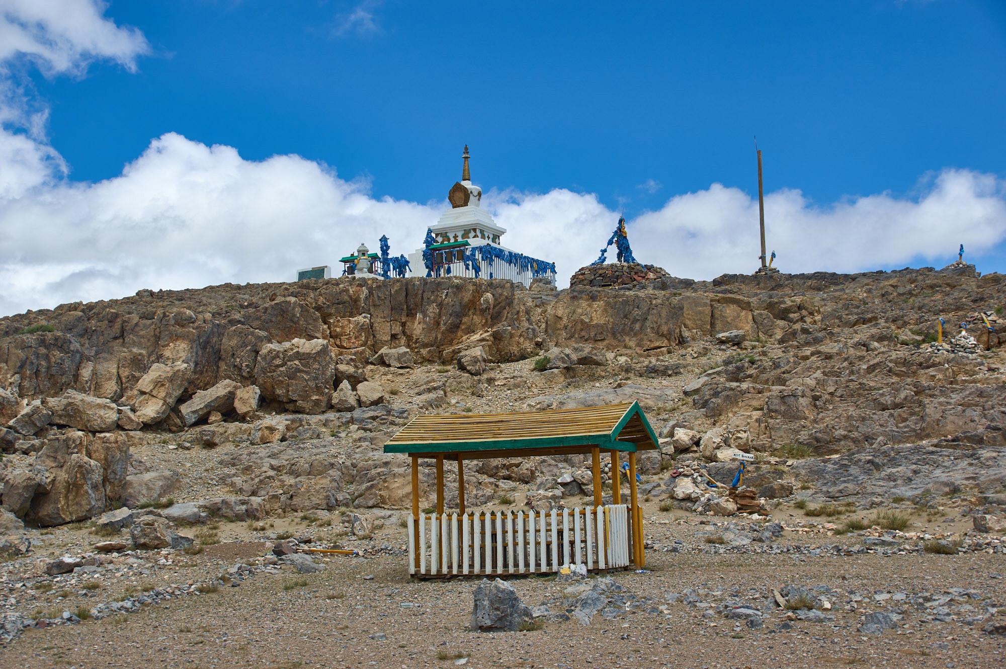 Вскоре замечаем одиноко стоящую скалу с буддистским сооружением наверху, забираемся по каменной лестнице наверх, покрутить барабаны и насладиться видами. Во все стороны наблюдается кочевья, стоящие то тут, то тут гэры, монгольские варианты тюркских юрт. Пейзаж впечатляет, именно за этим мы сюда и ехали.