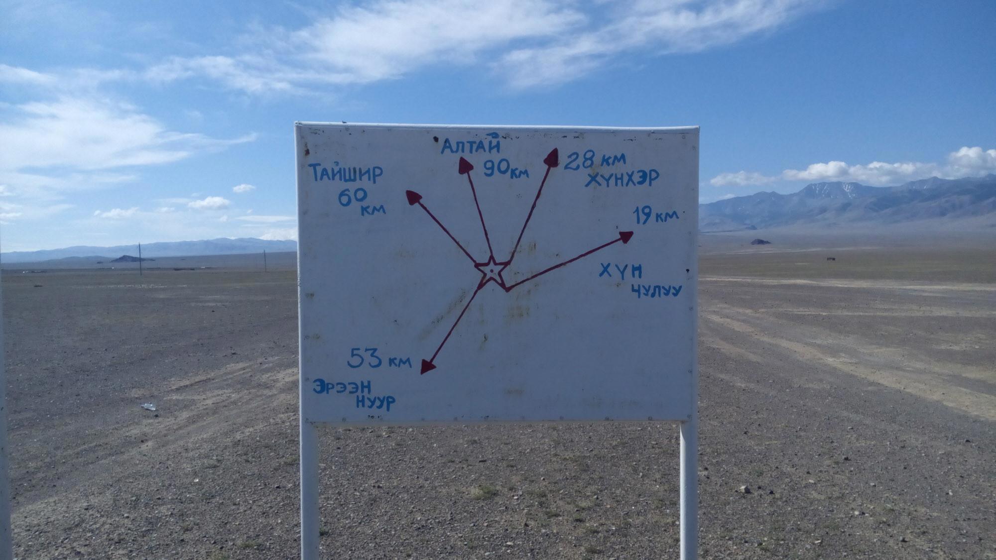 Вскоре проезжаем город Алтай. Да, почему-то монголы не хитры на выдумку, зачастую имена городков и поселков почти одинаковы. Почему так не знаю. Нам здесь сворачивать на север, асфальт заканчивается, начинается настоящая монгольская дорога. Выбираем понравившуюся из многих колею и несемся дальше. Здесь приходится ориентироваться только по навигатору и Мапсу. Ни инета, ни телефонной связи на ближайшие несколько дней, полностью выпадаем из цивилизации. Только вот такие дорожные указатели.