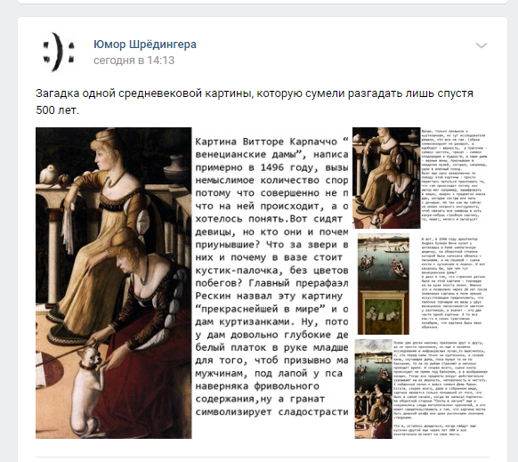 Автор: Татиана БерезницкаяОбычно я не приношу сюда то, что встречается мне на просторах инета или соц.сетей. Но в этот раз не удержалась. Пролистывая новостную ленту Вконтакте, наткнулась на совершенно чудный пост. И так это мне напомнило о некоторых любителях трактовать целые произведения по их отдельным частям и прочитанным отрывкам... что я таки решилась поделиться такой красотой. Понятное дело, что сложно трактовать картину, если имеешь в наличии только один фрагмент, но ведь находятся любители так же трактовать и при наличии целого