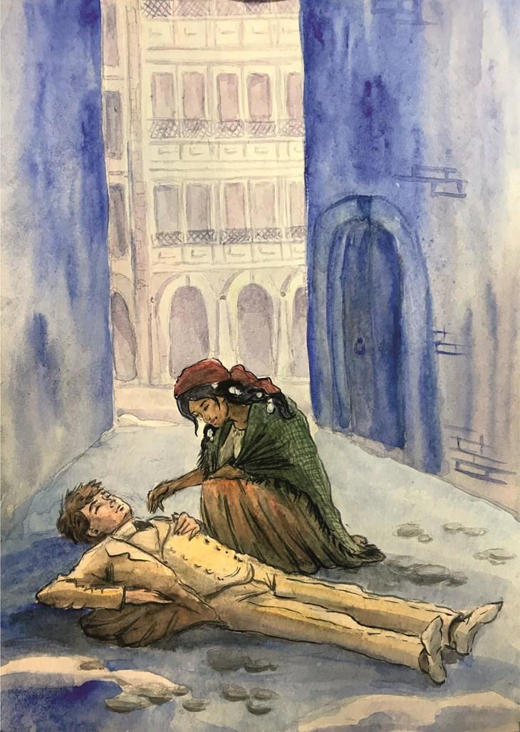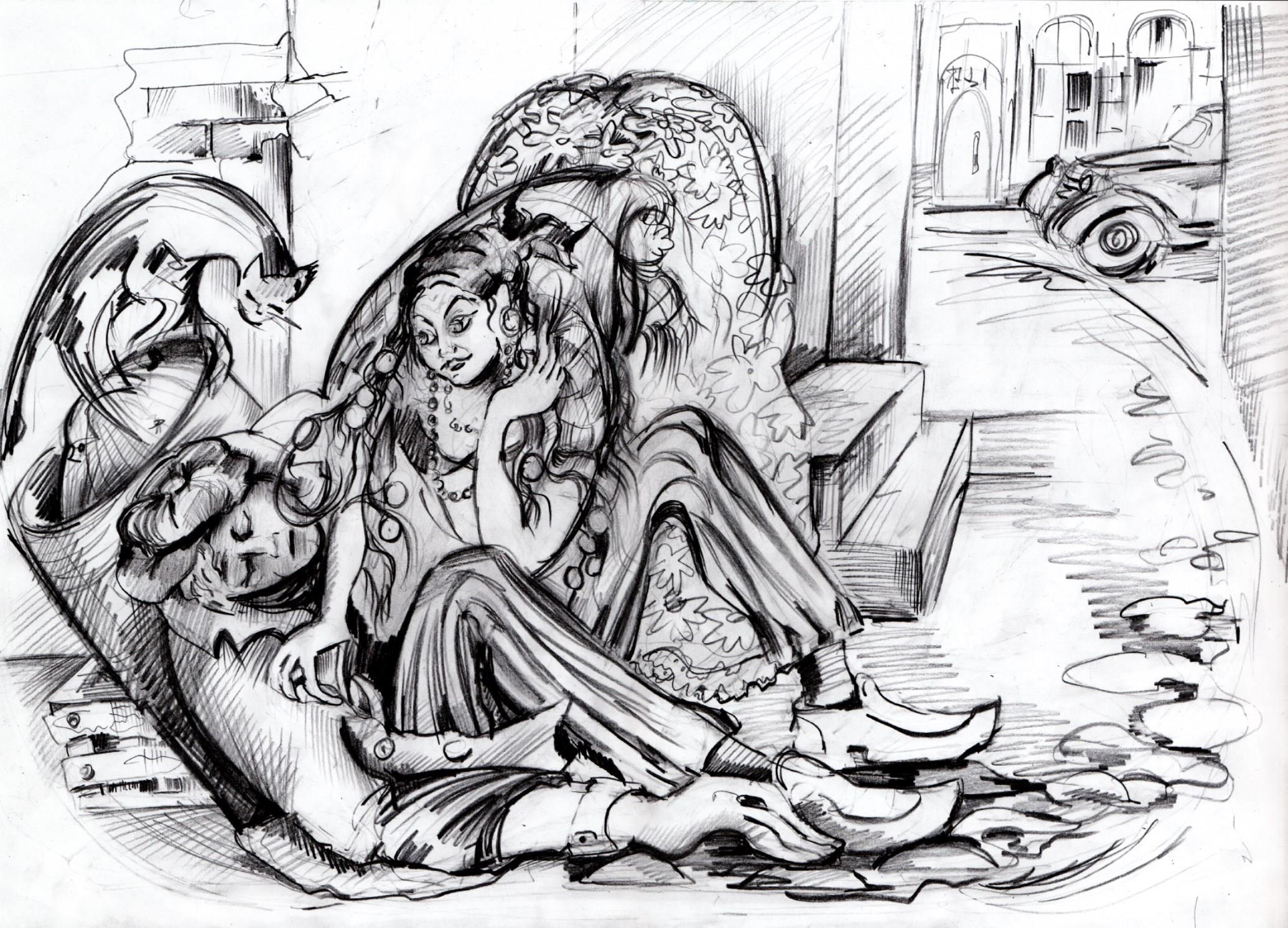Тут несчастного и огретого по головушке доктора Ланнэ, находит в подворотне уже знакомая ему цыганка Лула. Вот так это вышло глазами двух художников. Картинки кликабильны, можно поддержать конкурсантов))