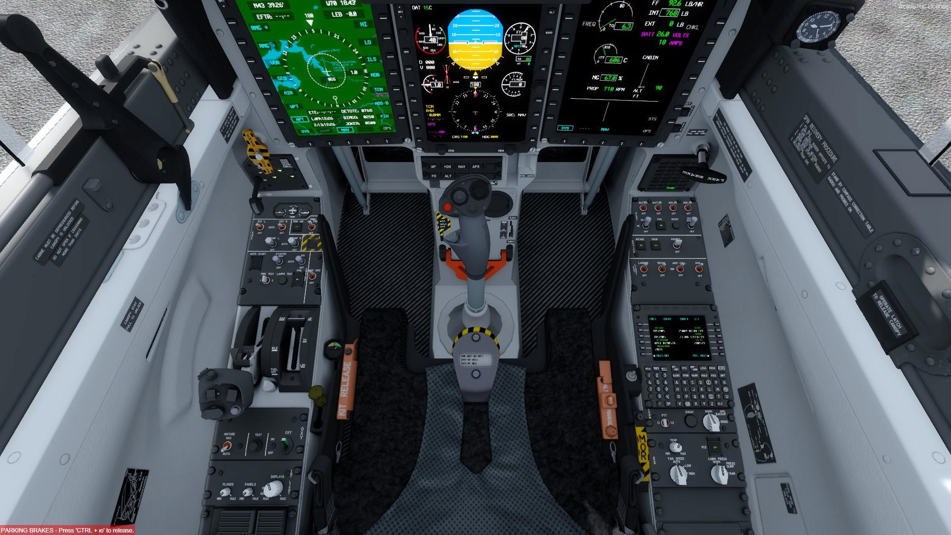 В остальном все стандартно. В наличии имеются индикатор на лобовом стекле, три многофункциональных дисплея, минимум тумблеров – из них работает процентов девяносто, что очень даже неплохо. Несмотря на то, что никакого оружия на модели не предусмотрено (реальный Пилатус можно использовать как легкий штурмовик), работают боевые режимы «воздух-воздух» и «воздух-земля». Можно потренироваться в прицеливании.