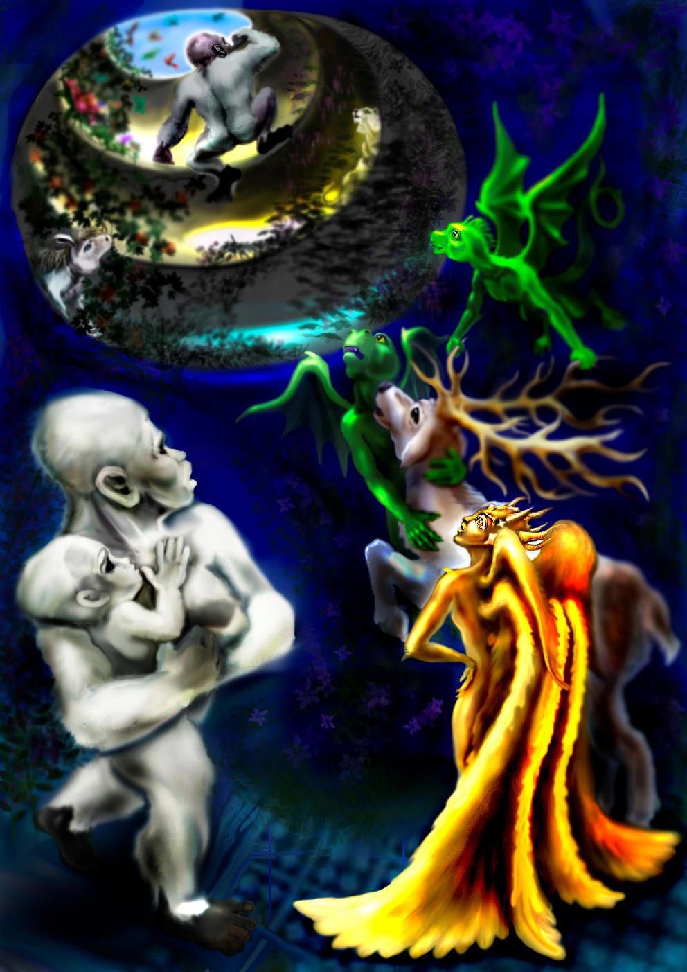 Вот и моя героиня встретилась с белым приматом, (уж очень мне хотелось изобразить именно белого "снежного человека"). А так как действие происходит после захвата вражеского корабля, ставшего тюрьмой для собранных с разных планет существ, то вполне оправдано появление и такого гуманоида. Бывшие хозяева корабля-пирамиды - черные змееящеры могли подобрать этот прекрасный образец фауны как с нашей родной Земли, так и на схожей с ней планете, как, впрочем, и всех остальных существ, наводнивших оставшийся без экипажа корабль.