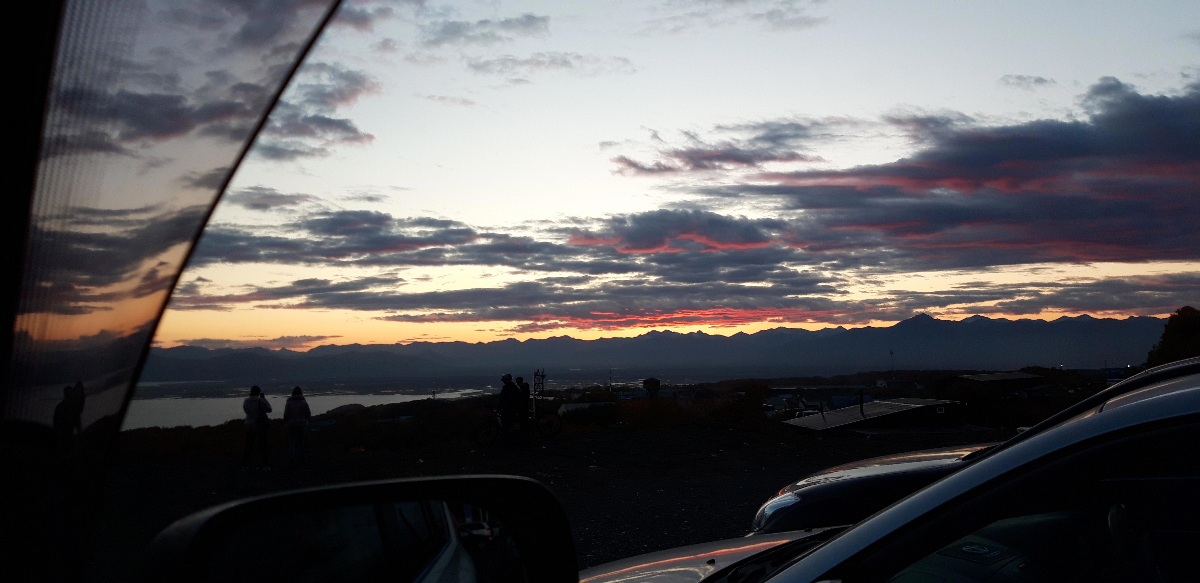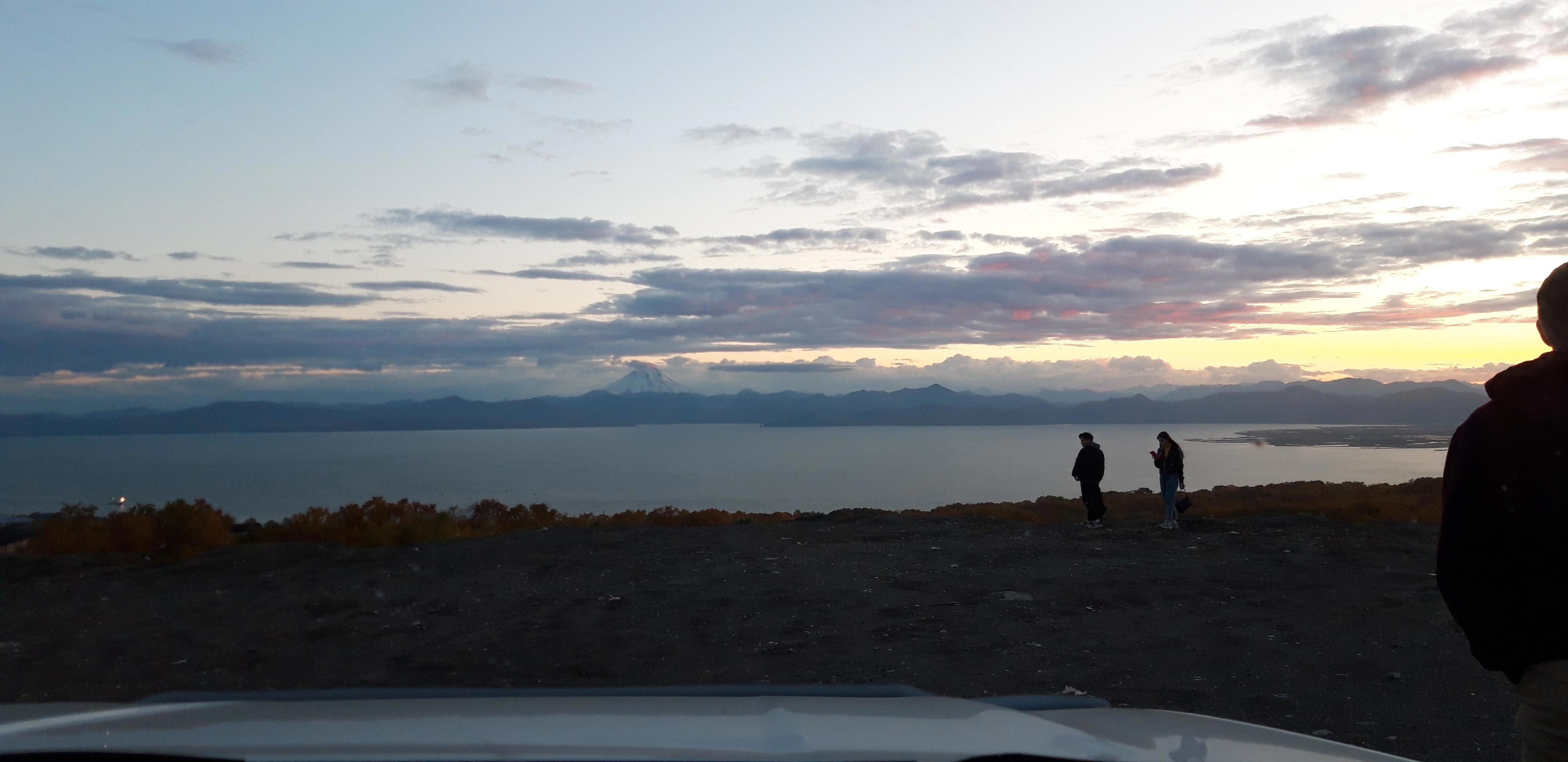 Паркуемся у живописного обрыва, просто сидим в машине и молча любуемся Вилючинским вулканом на той стороне бухты и большим небом.