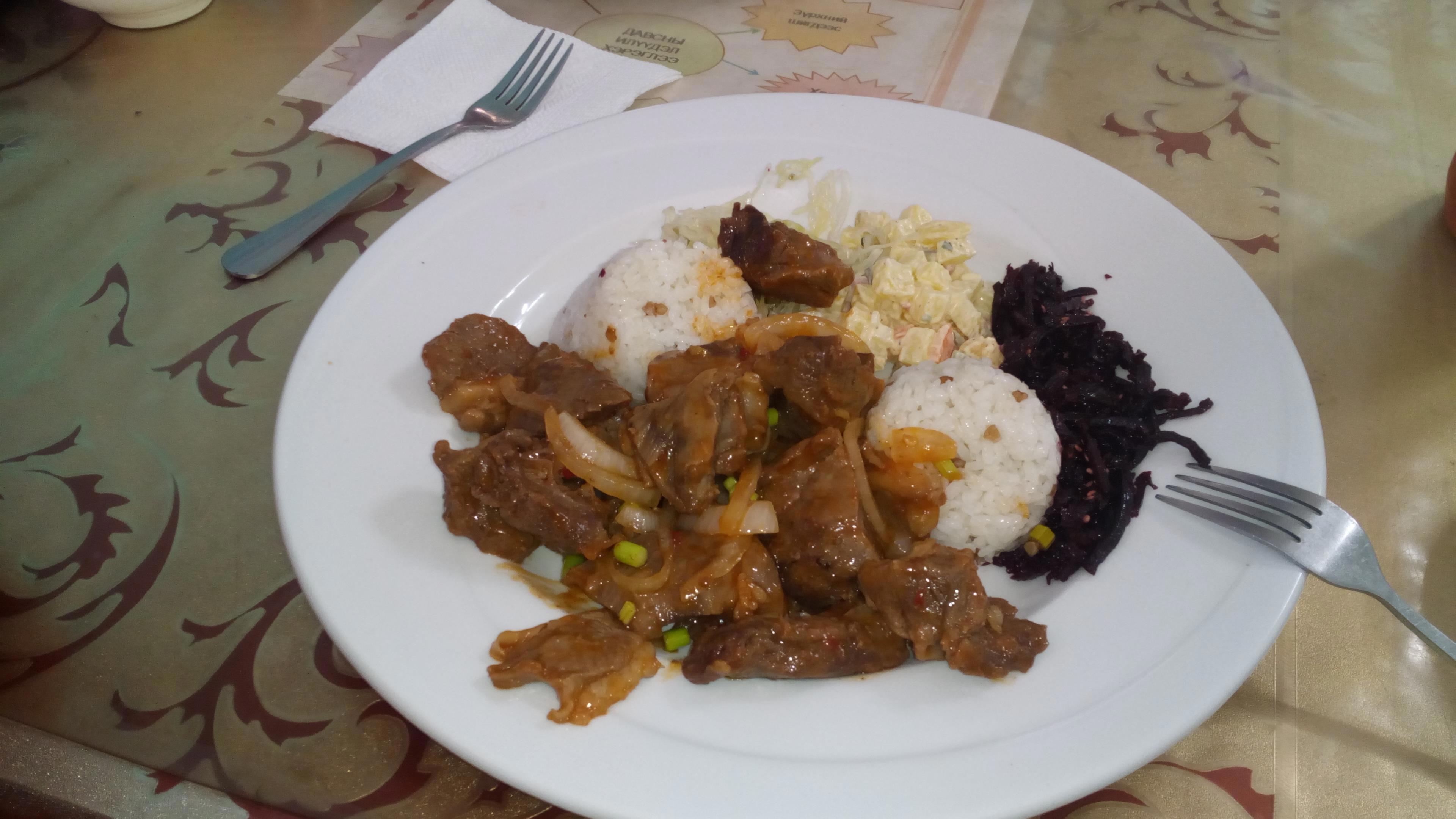 Русские здесь часто бывают проездом, меню имеет перевод, в качестве гарнира к мясу подали нечто похожее на салат Оливье и свеклу. Самое вкусное из этого, естественно, было мясо.