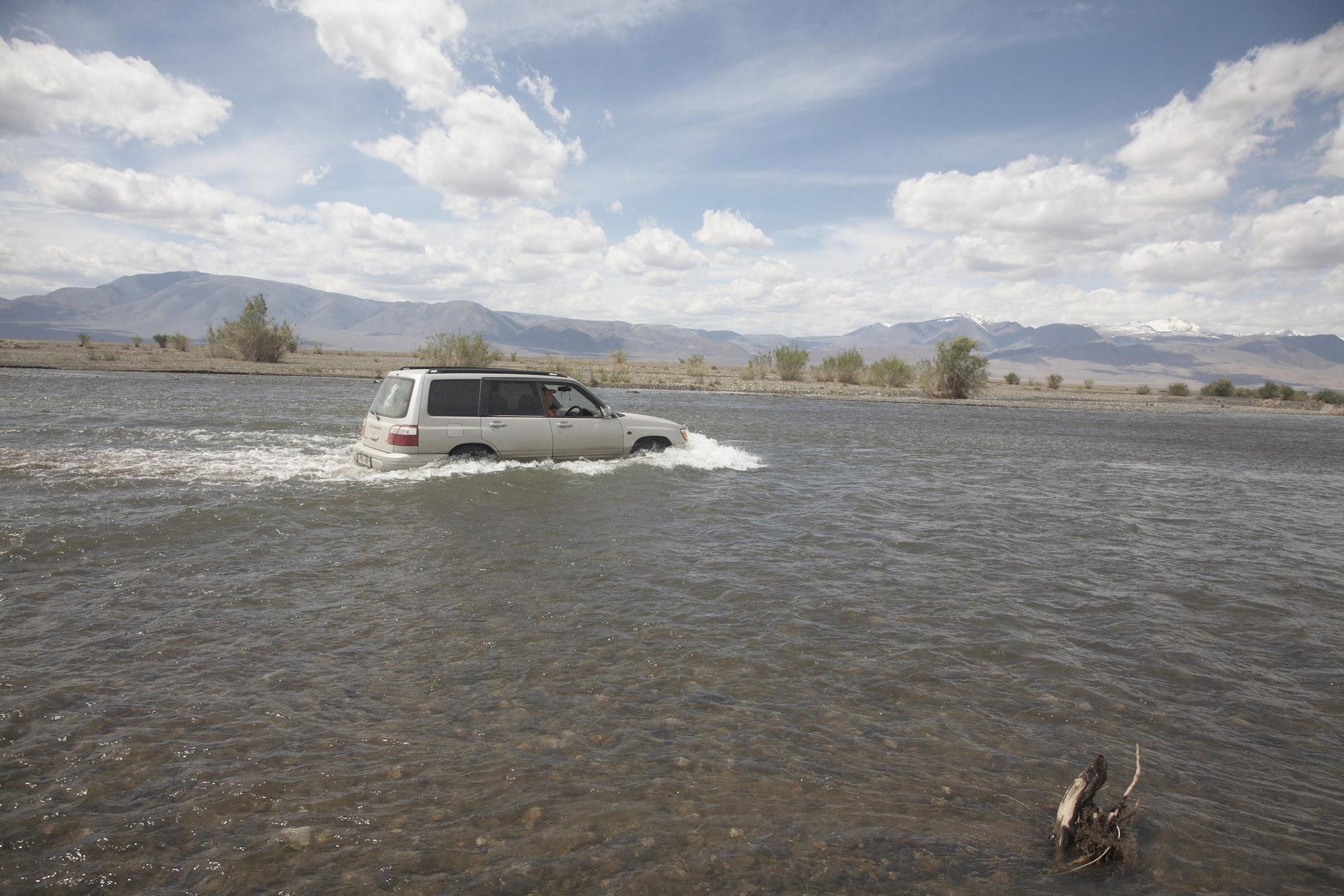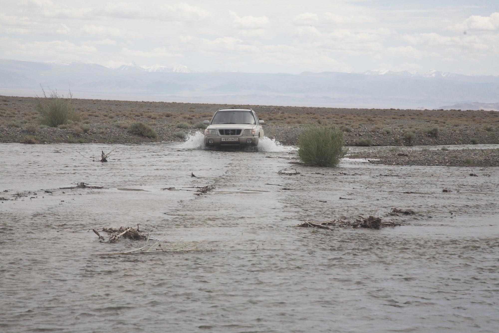 Внезапно на берегу появляется белый Форик с туристами, мы его уже видели в Улаангоме около той кафешки. Чудо! Поставьте господу лайк! Два монгольских гида везут в Ульгэ двух корейских дедков туристов. Решаемся вместе искать брод, все-таки две машины — это намного надежней. В случае чего один вытащит обратно. Камрад Билл берет палки и ходит взад-вперед. Наконец, он нашел нормальное место, правда, идти надо не напрямую, а сначала наискосок прыгнуть на островок, затем резко поворачивать и дальше гнать во всю ивановскую. Монгол водитель согласно кивает головой и прыгает в машину. Горячий монгольский парень! Рывок и он тут же благополучно застревает на островке. Билл чертыхается, прыгает в машину и несется за ним. Но монгол не так прост,уже выехал и несется через реку. Маладца! То-то они в свое время половину мира завоевали. Пока одни раскачивались, эти прыгали на коней! Само форсирование феерично и ужасающе авантюристично. Ну мы точно русские придурки!