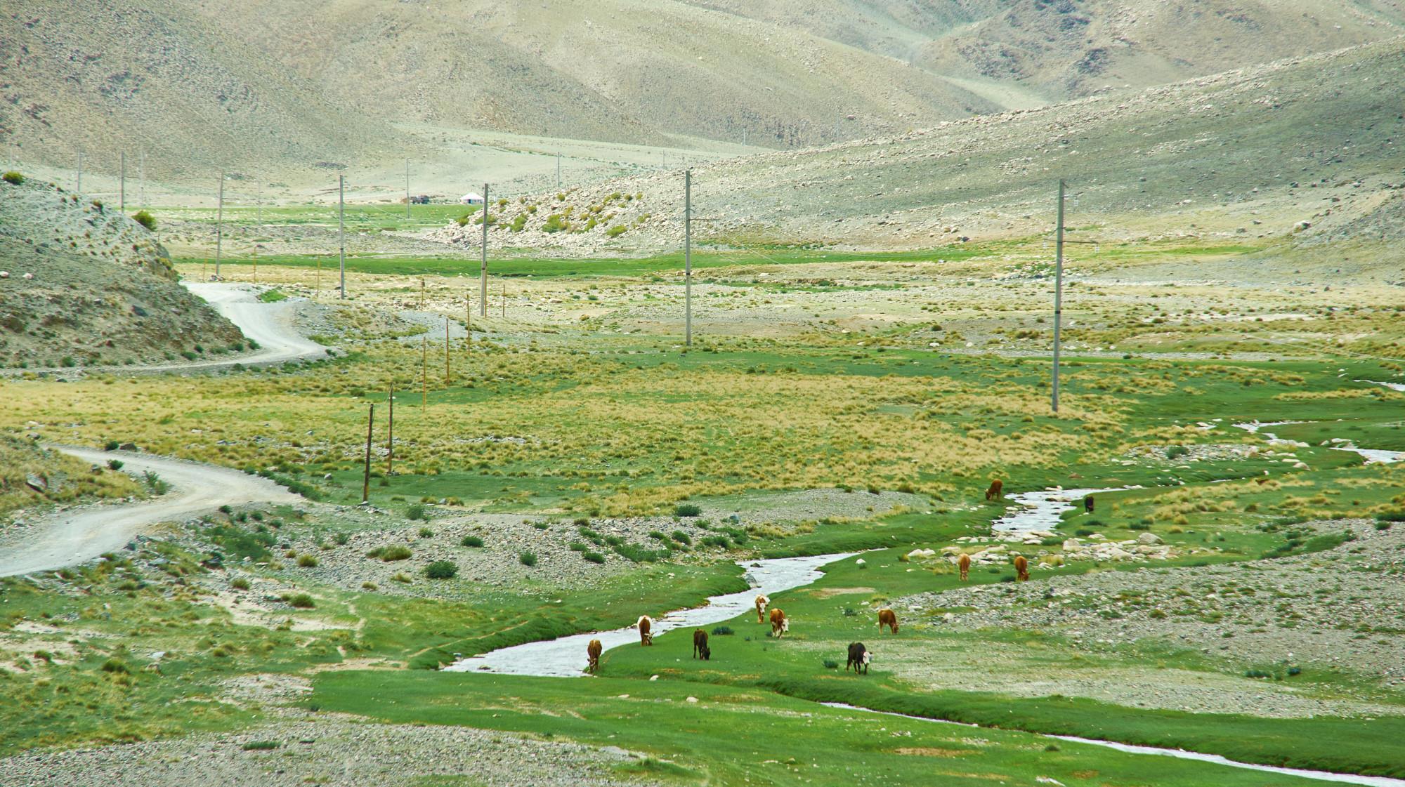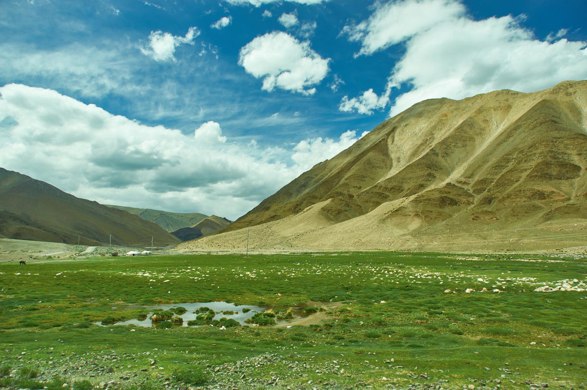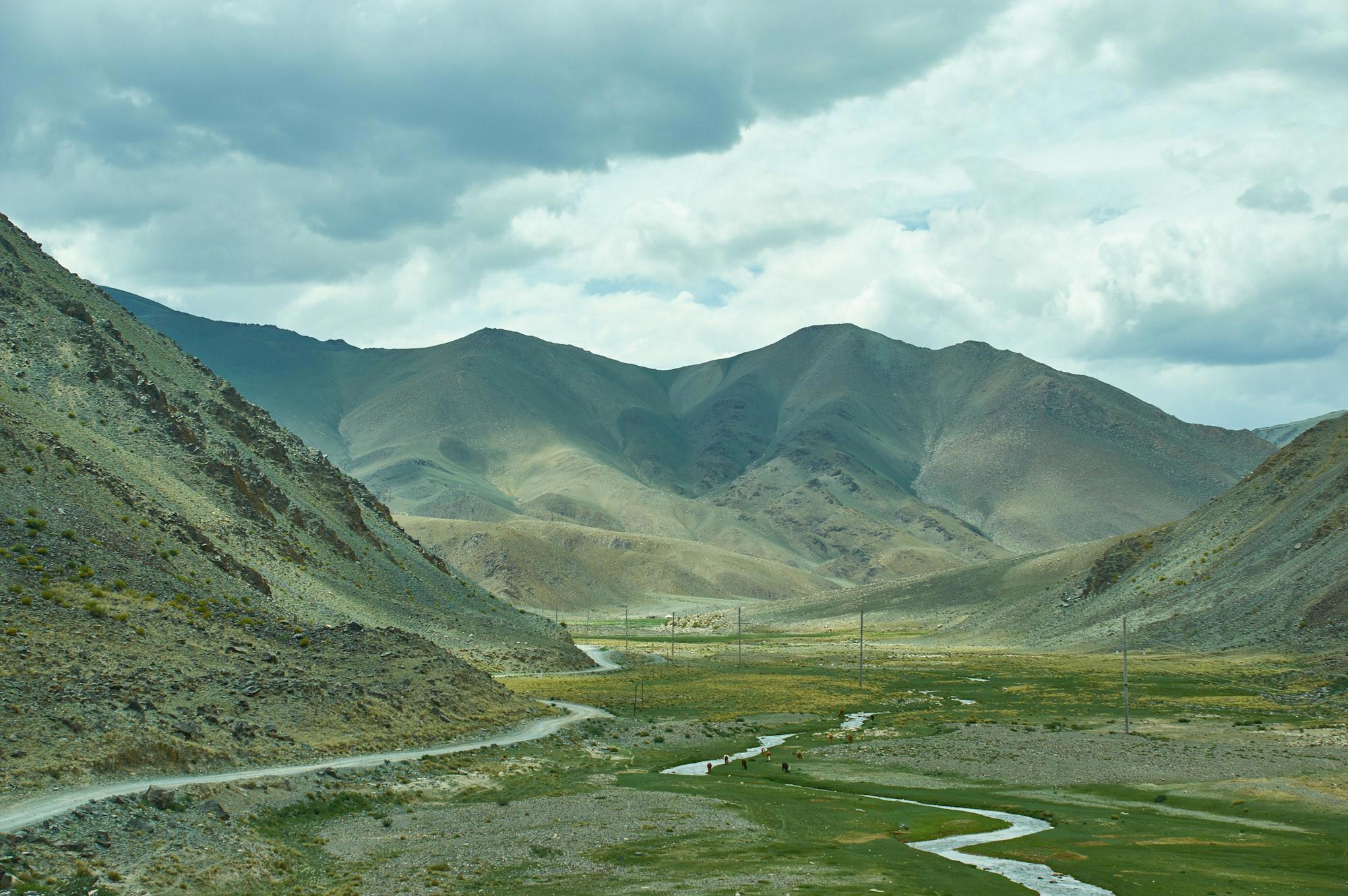 Дальнейший путь протекает по зеленым долинам и распадкам между гор. Открывается вид на высокие снежные вершины горного хребта Цаган-Шибэту, везде виднеются пастбища, пасущаяся скотина. Движение относительно оживлённое. Несутся куда-то московские туристы на Крузаках, местные работяги перевозят на небольшом грузовичке экскаватор. Как они только здесь проезжают?