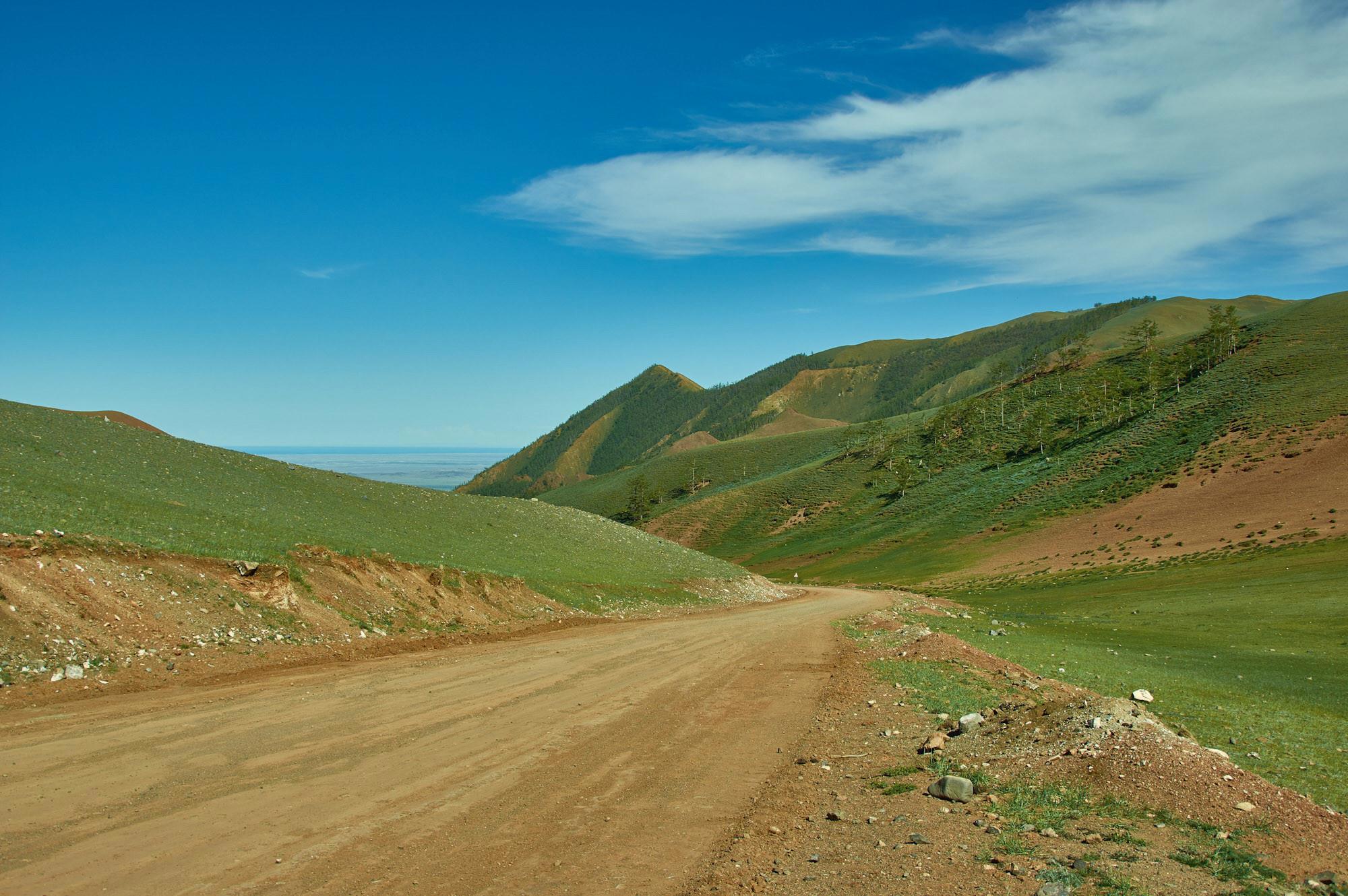 С право стороны вдалеке синеет огромное озеро Убсу-Нур, оно самое большой в Монголии. Но его берега нам не интересны, поэтому мы сворачиваем налево. Налево – это всегда дорога для мужественных! Грейдер лениво раскатывает коричневую дорогу, неспешно поднимающуюся вверх. Вскоре холмы зазеленели самыми настоящими соснами. Было приятно заново увидеть хоть какие-то деревья. Даже не думал, что соскучусь по лохматым красавицам.