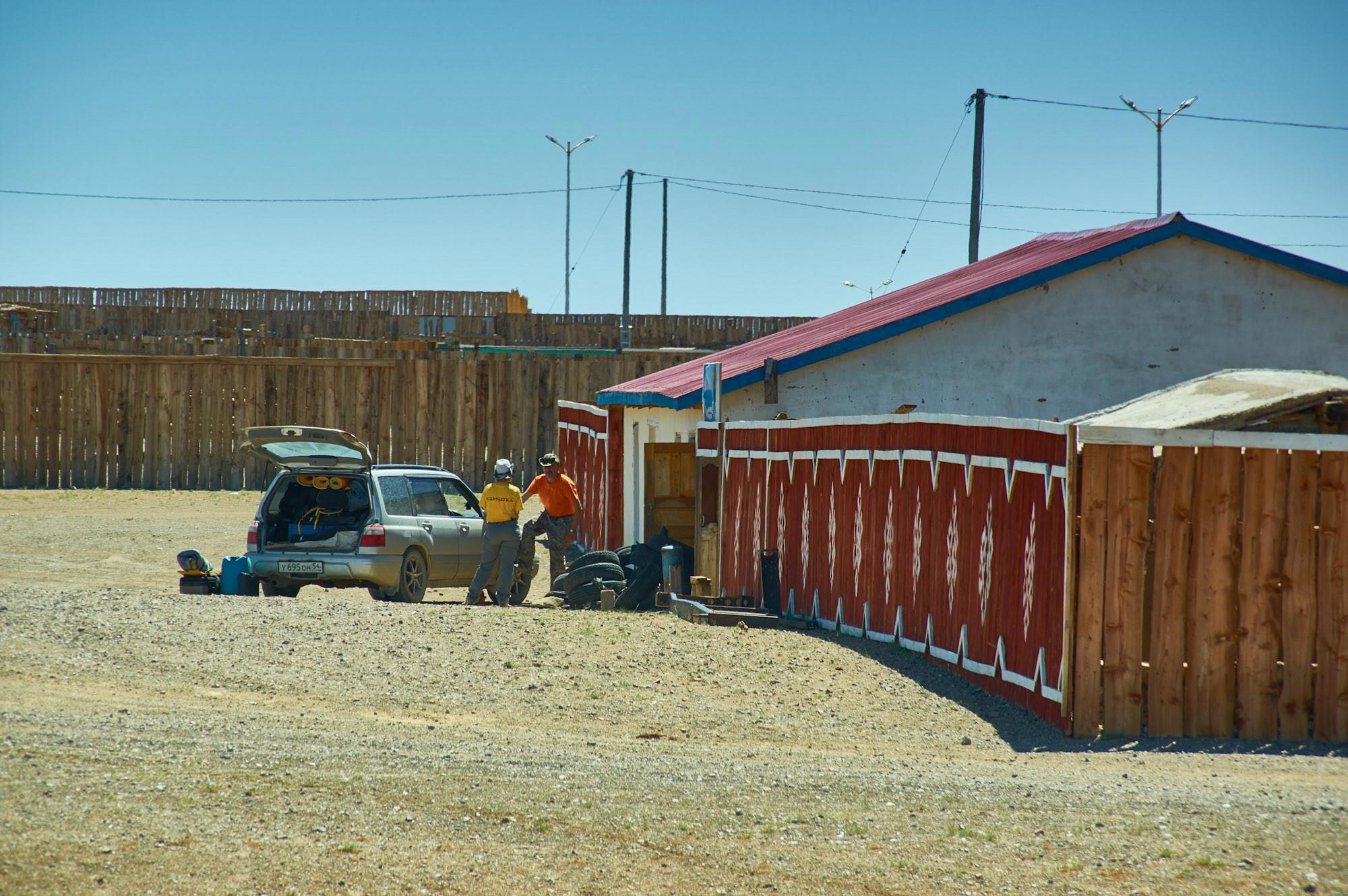 К сожалению, осуществить это нам не удалось, только мы выехали с базы, как работяги замахали нам руками. Колесо спустило, все-таки где-то напоролись. Опытные путешественники в Монголии всегда возят с собой несколько запасных колес. Но мы же авантюристы! Делать нечего, придётся ехать в ближайший Автозасвар, то бишь местный шиномонтаж. Благо, нам объяснили, что это по местным меркам относительно недалеко.