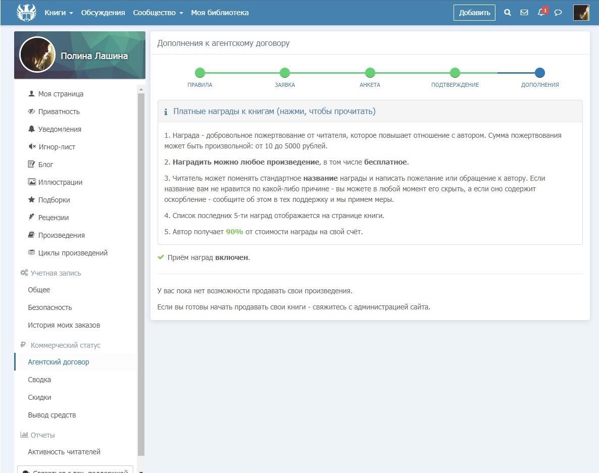 Во-вторых, всё еще не имея ком.статуса вы можете подключить "Награды" (появится кнопочка "Наградить" под названием ваших книг или сбоку в панели, будет видна вашим читателям). Для этого надо подать заявку, предоставить инфу о себе. И что приятно - 90% от стоимости награды достанется автору!!! (здесь говорили, что на Литнете автор вообще не увидит награды от читателей в своем кошельке)