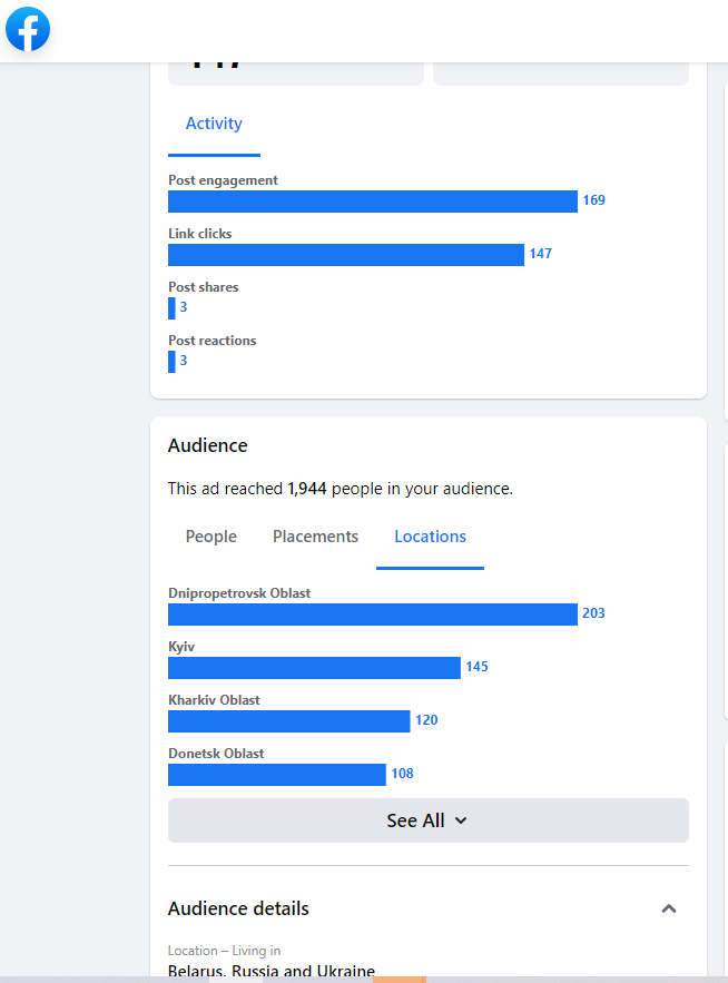 Рекламу запустила всего на четыре дня (рекомендованный Фейсбуком минимум), бюджет тоже установила минимальный рекомендуемый: 400 форинтов в день (это чуть больше одного евро, в рублях не знаю). И... тронулись.