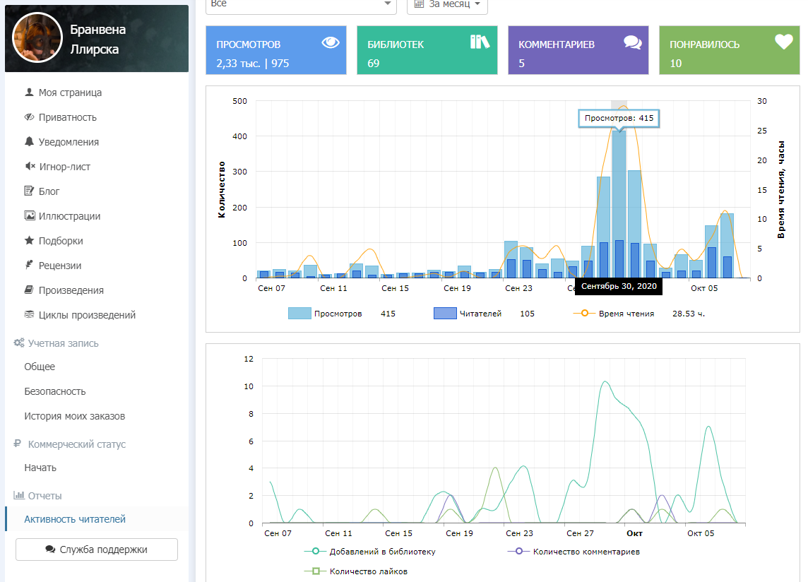 В общем, отметка часов чтения в сутки дошла почти до 30-ти, посещений в день больше четырехсот, за все четыре дня скромной рекламной кампании книгу добавили в библиотеки более полусотни раз (точно не считала). По завершении оной кампании показатели опять упали (хотя и остались чуть выше средних за предыдущий месяц), новый, вчерашний всплеск — это публикация в ВК-паблике Книги: Фантастика, ЛитРПГ, Фэнтези. Он порядком не дотягивает до того, что последовал за таргет рекламой, но зато бесплатно, да.