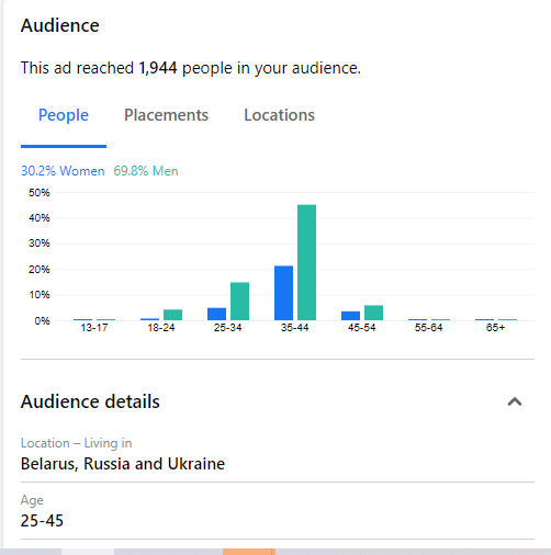 В целевую аудитории я выбрала три страны: Россию, Украину и Беларусь. Хотела добавить еще Казахстан, но Фейсбук резко заявил, что тогда охват будет меньше тысячи человек (почти уверена, что это глюк, но рисковать не стала). Возраст поставила от 20-ти до 45-ти (выборка читателей, возраст которых я знаю, у меня пока небольшая, большинство шифруется, так что решила так), половых ограничений не вводила, сама считаю, что книжка у меня вроде как «унисекс», в интересах поставила «темное фэнтези» и «кельтская мифология». Собственно, всё.
