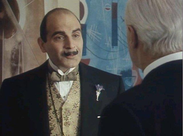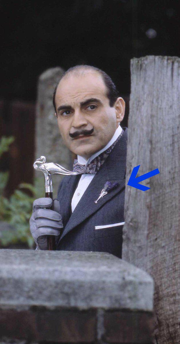 Помните, у Эркюля Пуаро на лацкане всегда был букетик? И каждый раз в нём были разные цветы. На всякий случай на первой картинке он обозначен стрелочкой.