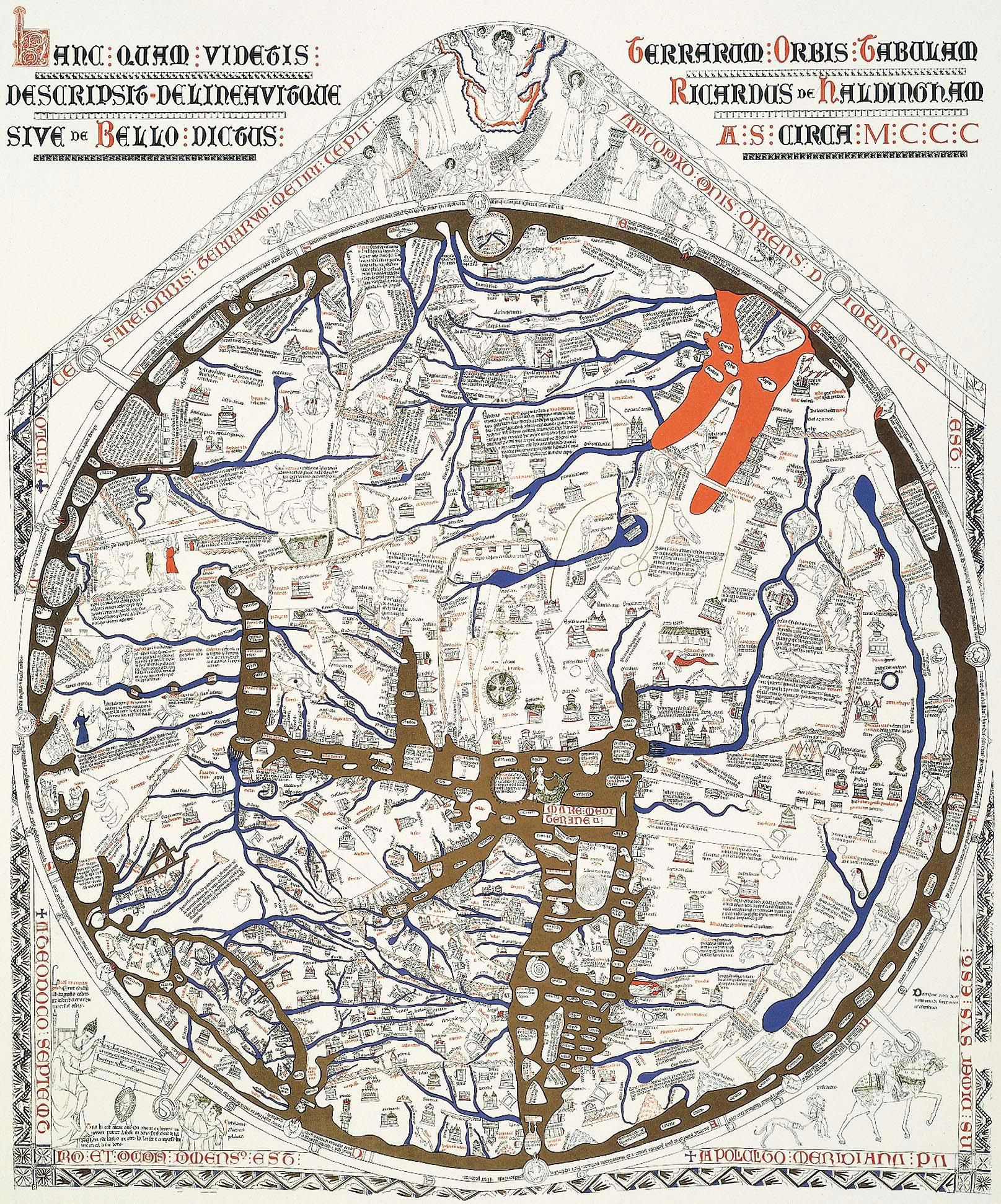 Фишка, которая меня зацепила, даже не в том, что это самая старая карта, из сохранившихся средневековых попыток нарисовать географию мира. А в том, что вместе с разными частями мира, городами и прочим на этой карте нарисованы мифические существа, олицетворявшие представление рисовавших карту о неизведанных землях, и что там ждет.