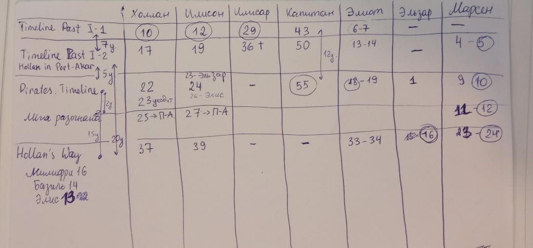 Ещё есть мини-табличка с возрастом персонажей этой и второй книги в разные "исторические" промежутки времени. Она мне очень помогала в самом начале, когда я только-только начала писать и сама только разбиралась в том, что варится у меня в котелке))