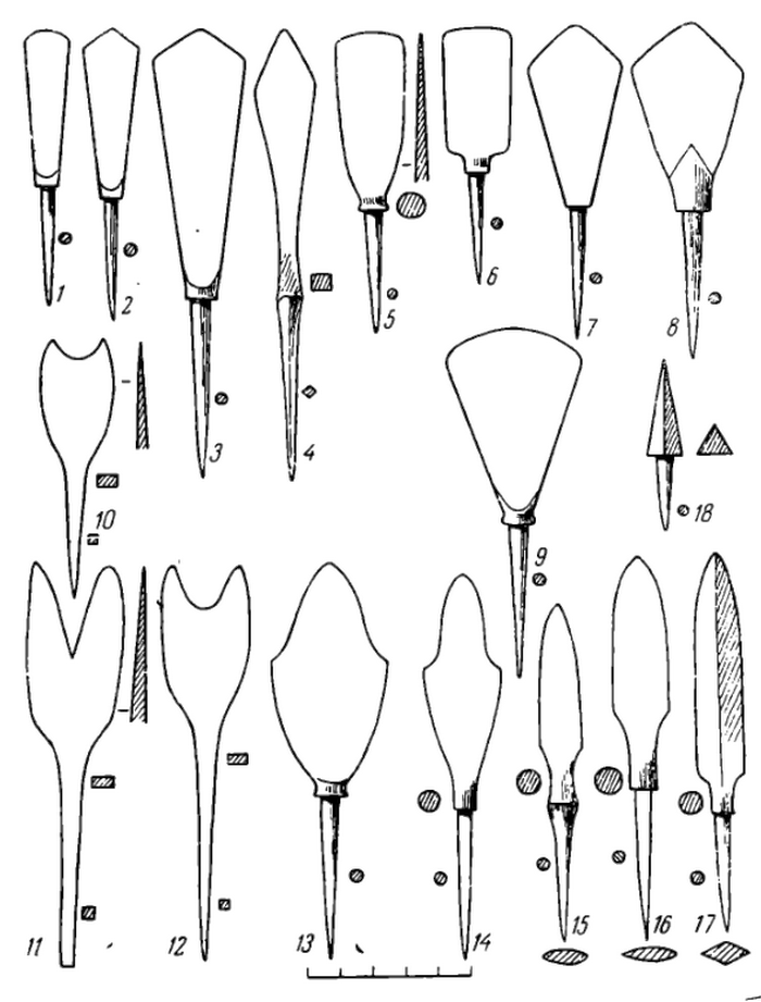 Ещё раз напомню, что статью свою тов. Медведев написал в 1966 году. И это очень важно. Дело в том, что к этому времени можно было все эти наконечники отдать в лабораторию для того, чтобы провести химический и прочие анализы железа, из которого они были сделаны. Датировать их невозможно было ни тогда, ни сейчас, но зато можно было легко и просто определить, каким именно способом был изготовлено железное изделие. То есть, откуда брали руду и какие именно технологические приёмы были использованы при их изготовлении. И не нужно было для этого каких-то особых лабораторий. Любой их технических ВУЗов Советского Союза имел к тому времени достаточное для этого оснащение. Даже некоторые техникумы могли это сделать без особого напряжения. Я уже не говорю про специализированные НИИ, которых в стране было пруд пруди. Но автор статьи весьма хитро ограничивается школьной линеечкой. Не знал? Или не хотел?.. Думаю, что эта информация для него была просто не нужна – при её появлении пришлось бы писать совсем другую статью с совершенно другими выводами.