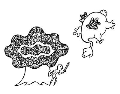 Вот взять, скажем, Бармаглота. Перевод, по умолчанию, Орловской - ну, где летит ужасный Бармаглот и пылкает огнём. Существо это в тексте не описано вообще, но по смыслу кое-какие намёки есть. Летит, огнём, ужасный - всё такое. Сперва мы пытались обсуждать. А потом решили, что можно нарисовать.