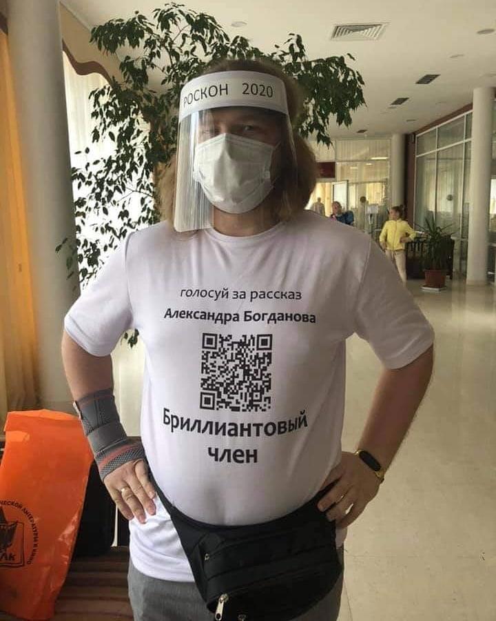 Там мы обсуждали стратегию продвижения рассказов нашей фантастической тусовки на голосовании. Я подготовился хорошенько - напечатал рекламную футболку с QR-кодом, чтобы рассказ можно было прочитать, и аналогичные визитки, которые раздавал всем подряд (даже Лукьяненко досталась). На обратной стороне и футболки, и визитки написано "На особенном Росконе должен победить особенный рассказ".