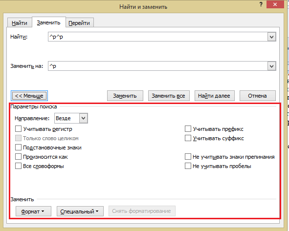 В верхнем окне забиваем «^p^p», в нижнем «^p». Вычищаем до нуля. Если у вас есть важные пробелы между фрагментами текста, а ненужных лишних строк мало, лучше заменить не автоматически, а кнопками «найти далее», «пропустить», «заменить». А вообще лучше такие моменты разделять тройными звёздочками – они видны при любом варианте отображения текста.