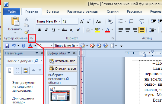 Также очень удобно работать с панелью буфера обмена (нашла только в Ворде). Она открывается, если нажать на уголок кнопки «Буфер обмена». Вот тут