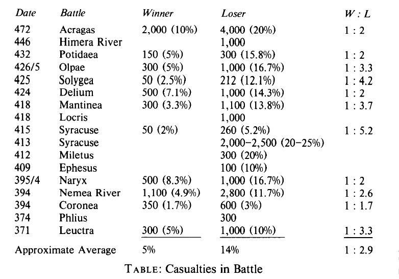 Средний процент погибших в рядах победившей армии составляет 5%, проигравшие теряли почти в три раза больше - 14%. Сам Крентц в выводах отмечает, что для небольшого греческого полиса потеря даже 5% участвовавших в битве гоплитов могло восприниматься как общественная трагедия. С этим трудно не согласится.