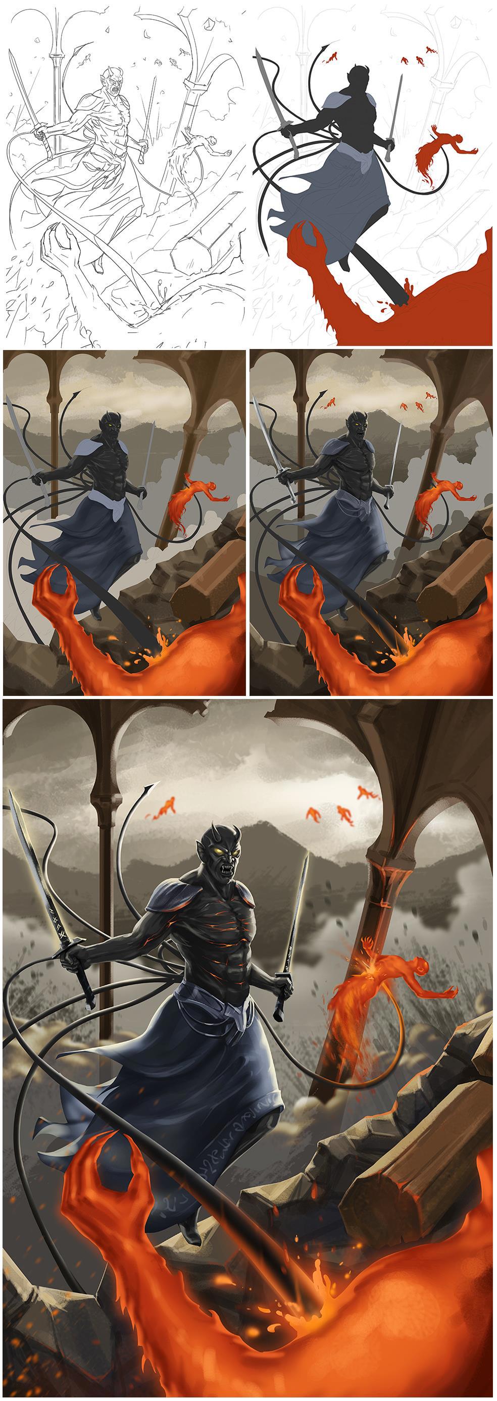 Автор: Салихов ВасильВ какой-то мере у меня была свобода выбора, что изображать на обложке для 6 тома книги Романа Хренова - "Путь в бездну. Пепельный Король". Однако я недолго выбирал, поскольку давно хотел нарисовать что-нибудь динамичное и жутко фэнтезийное. Получилось так, что самому захотелось окунуться в мир Бездны.) Хронология создания ниже.