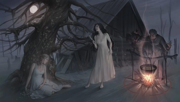 На иллюстрации сцена колдовского ритуала - призрачная колдунья Лесана, дабы снова стать живой женщиной стремится завладеть телом её потомка Ксении. Помогает Лесане старый злой колдун.