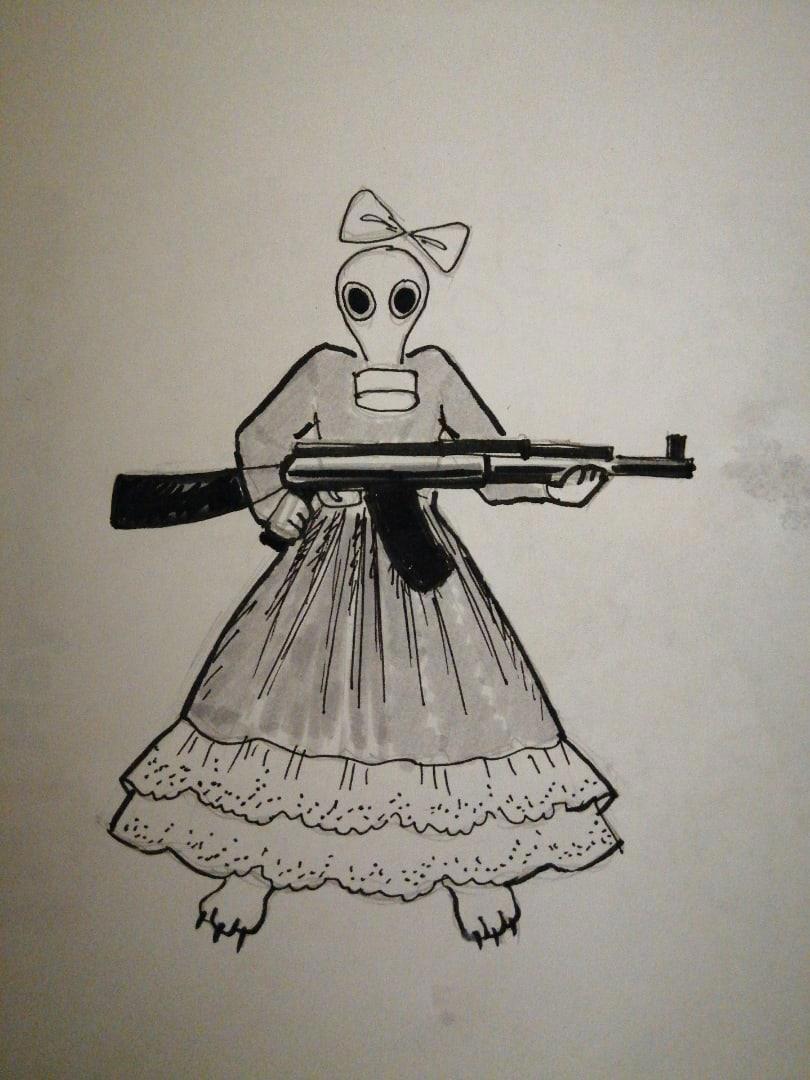 Светлана Нечаева осчастливила меня замечательным фанартом к роману «Гимназистка». Бантик необычайно удачно оттеняет противогаз, оборки на юбке прекрасно сочетаются с когтями, Боюсь только, главный аксессуар - автомат - не совсем соответствует эпохе)