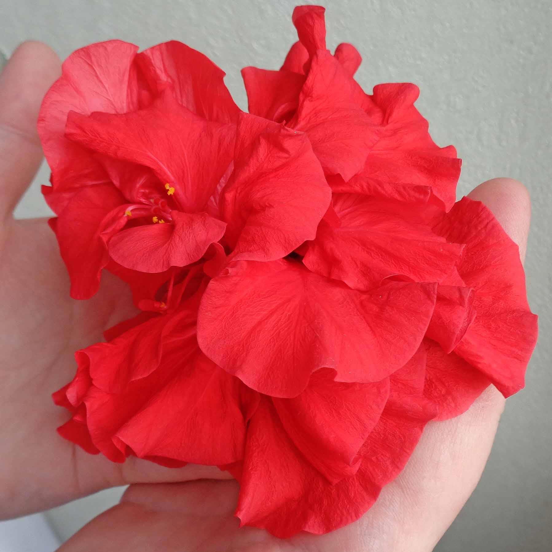 Автор: Маргарита ГуминенкоРастёт у меня гибискус (он же - суданская роза или каркаде). Давно уже, лет 20. Периодически цветёт. Вчера упал распустившийся цветок. Сам, никто его не отламывал. А такой красивый, что я его положила аккуратненько на полочку, пожалела. И вот такая удивительная история, что он несколько часов оставался красивым и свежим.