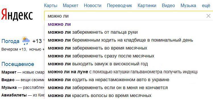 Автор: СержС целью узнать, чем, всё-таки конкретно, женщина отличается от мужчины, я только что поставил опыт. В Яндекс я ввёл поисковый запрос: "Можно ли" с включёнными подсказками. Честный поисковик выдал мне наиболее часто встречающееся продолжение: "забеременеть от пальца руки". Это факт, в который нелегко поверить, но легко проверить (см. скриншот).