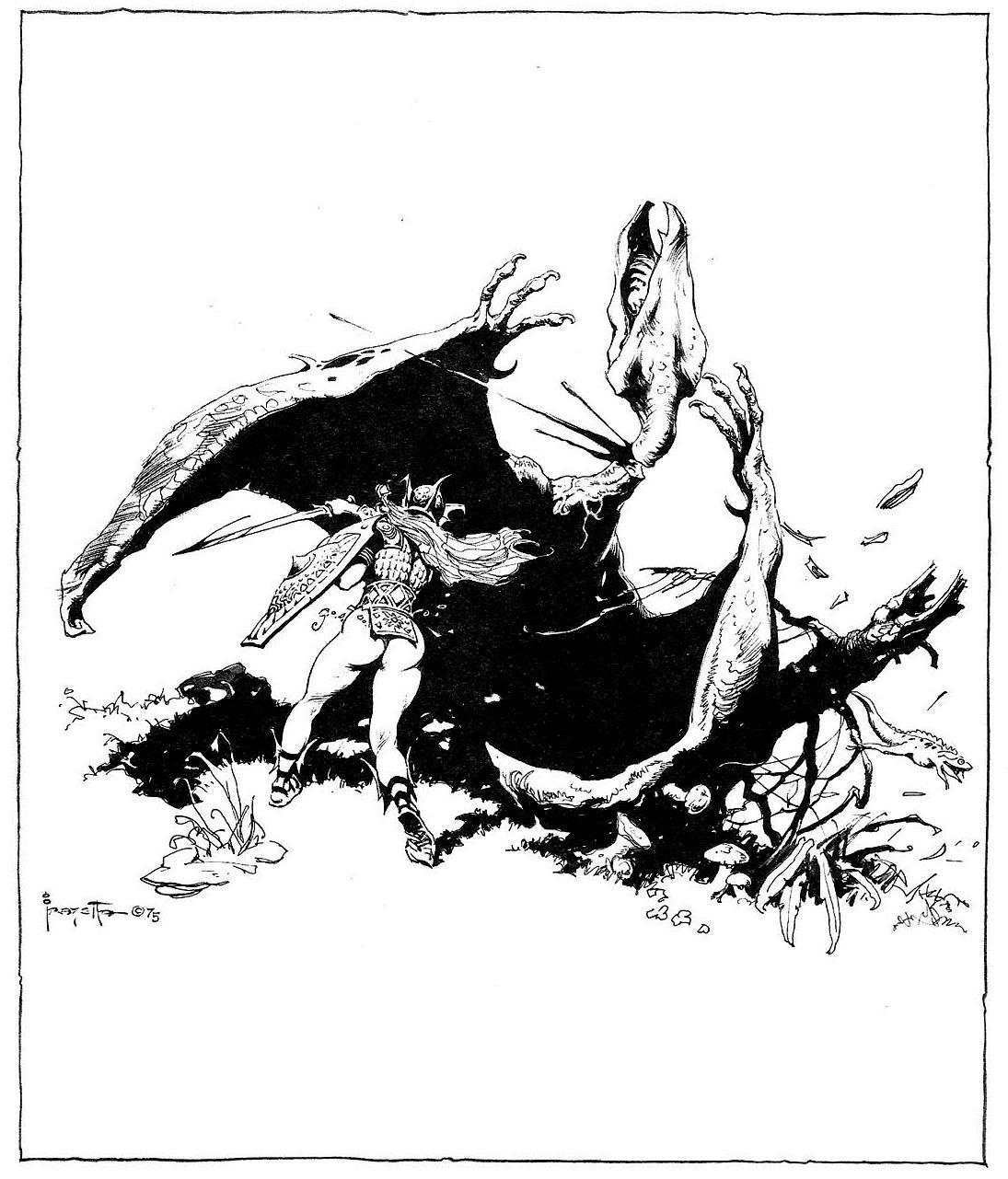 Слово «фантастическая» я использовал неспроста. Формально, у Фрэнка прекрасное знание анатомии и динамики тел – его стиль лично мне нравится гораздо больше, чем Бориса Вальехо (у которого все мужики выглядят как обмазанные маслом бодибилдеры, потому что он сам бодибилдер, а бабы словно вылезли из трэша 70-х) или Луиса Ройо (у него почти все работы унылые, вылизанные и статичные). Фразетта – парень другой эпохи, в его творчестве живёт дух старой школы! Рисовку персонажей одобрил бы Рубенс, а цвета и детали отсылают к титанам модерна.