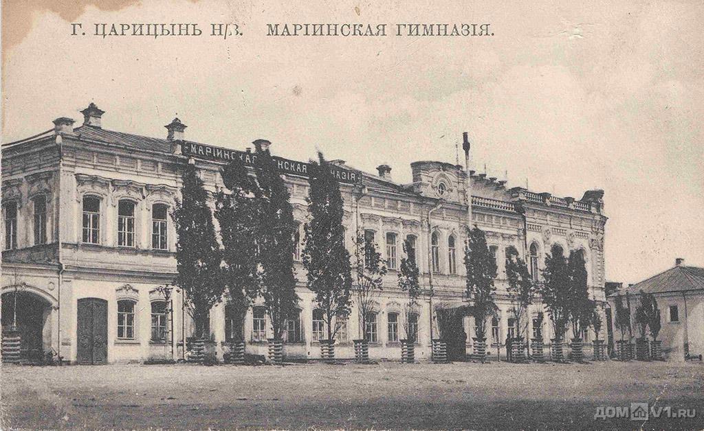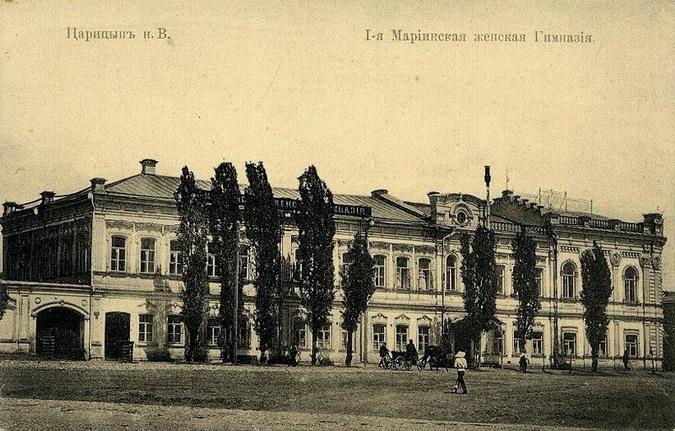 Мариинская женская гимназия (а это именно она) была открыта в 1877 году и получила своё название (как и Александровская мужская) по случаю посещения Царицына будущим императором Александром Третьим (тогда ещё цесаревичем) с женой Марией Фёдоровной. Здесь здание в полной красе со стороны улицы Петровской (позже Краснопитерской, ныне Чуйкова):