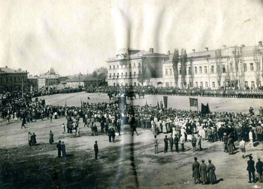 А это - первомайская демонстрация 1921 года там же, и вновь (уже бывшая) гимназия прекрасно видна, никаких серьёзных изменений в её облике не произошло.