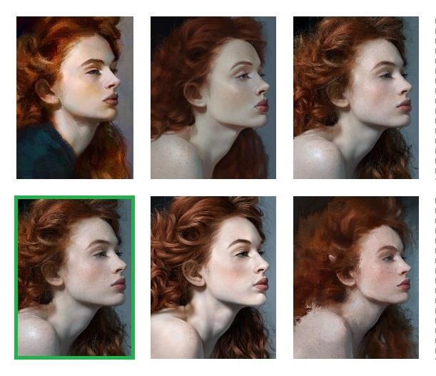 Есть подборка картинок, демонстрирующих, как внешность модели на исходной фотографии меняется в зависимости от стиля художника (зеленой рамкой отмечено исходное фото).