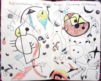 Нам нужно было нарисовать свою работу в духе этого художника-сюрреалиста. Для этого вначале нужно было составить Словарь символов, который использовал художник в своих работах Я взяла свой новый, привезённый из Сочи, скетчбук, открыла в интернете каталог работ Жоана Миро и принялась перерисовывать элементы, обнаруженными в них.