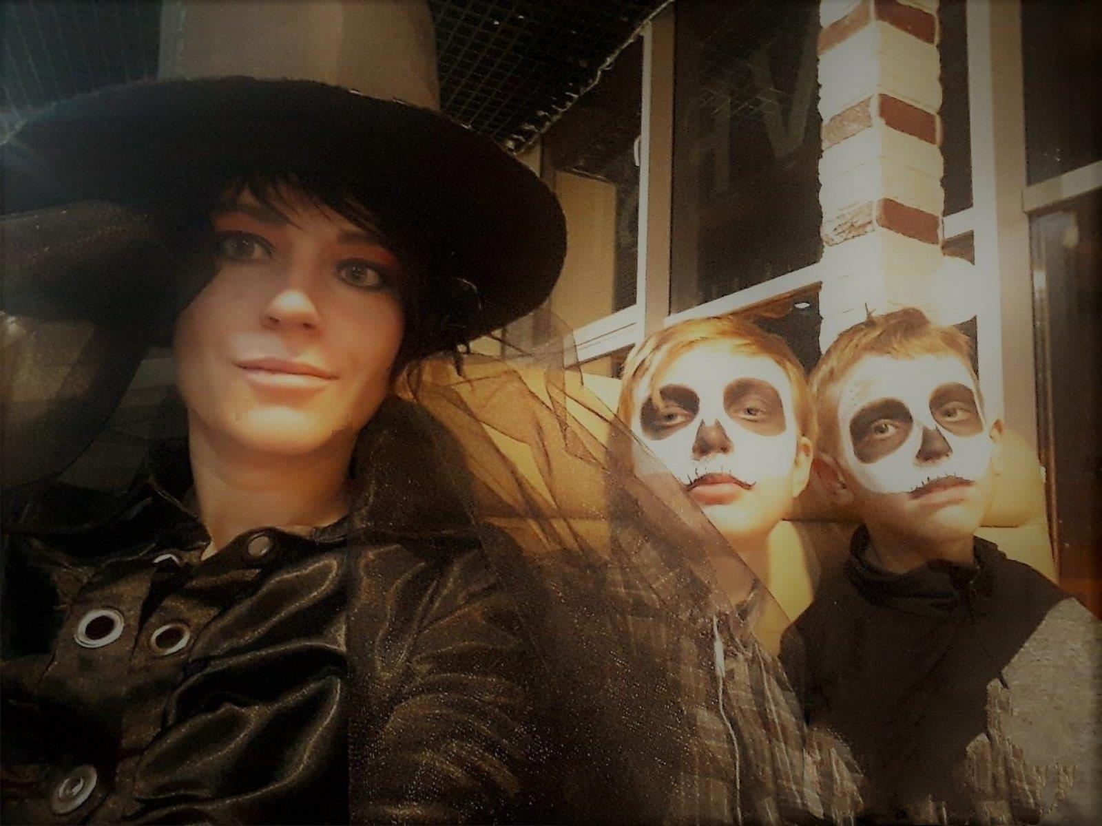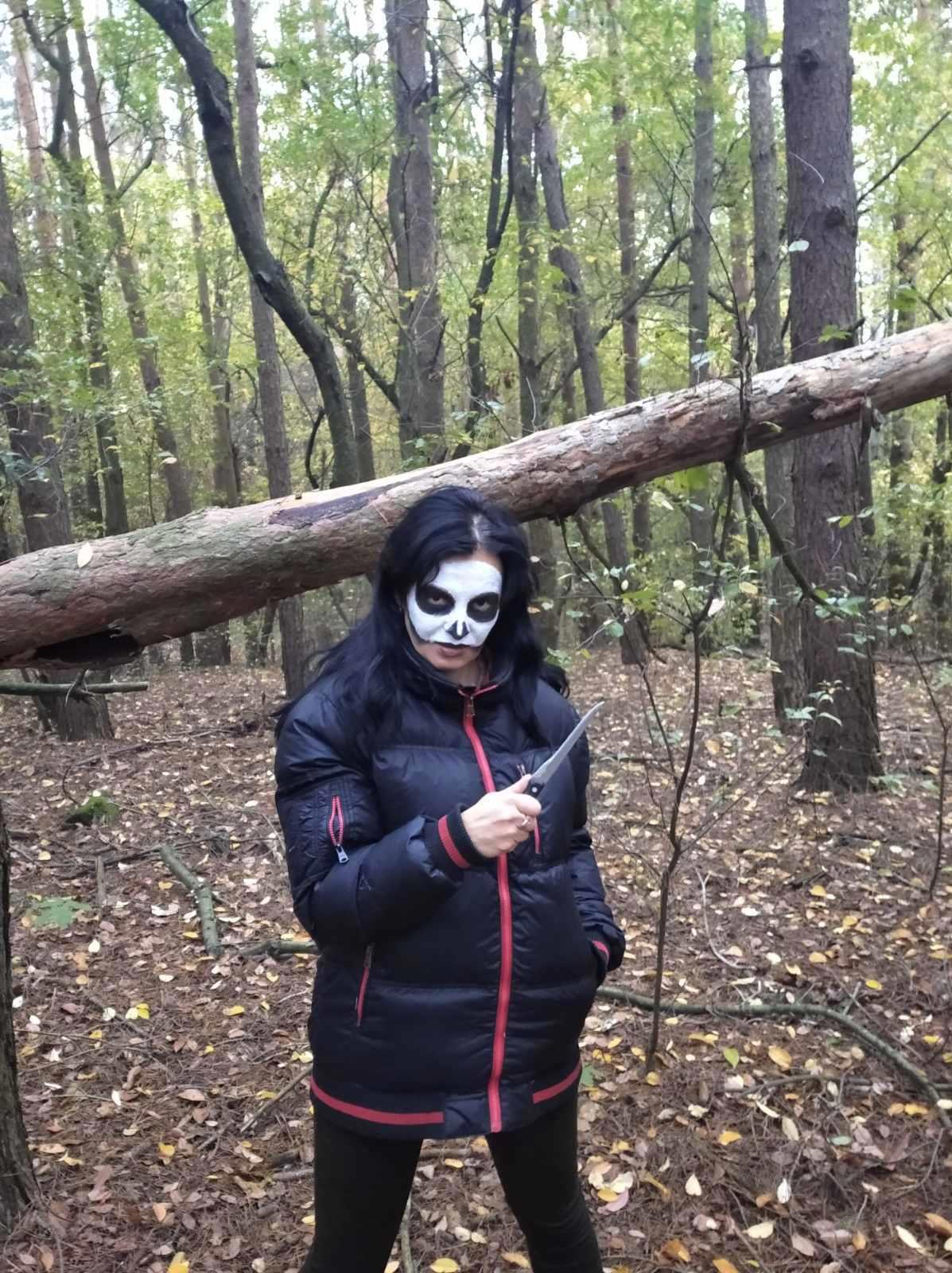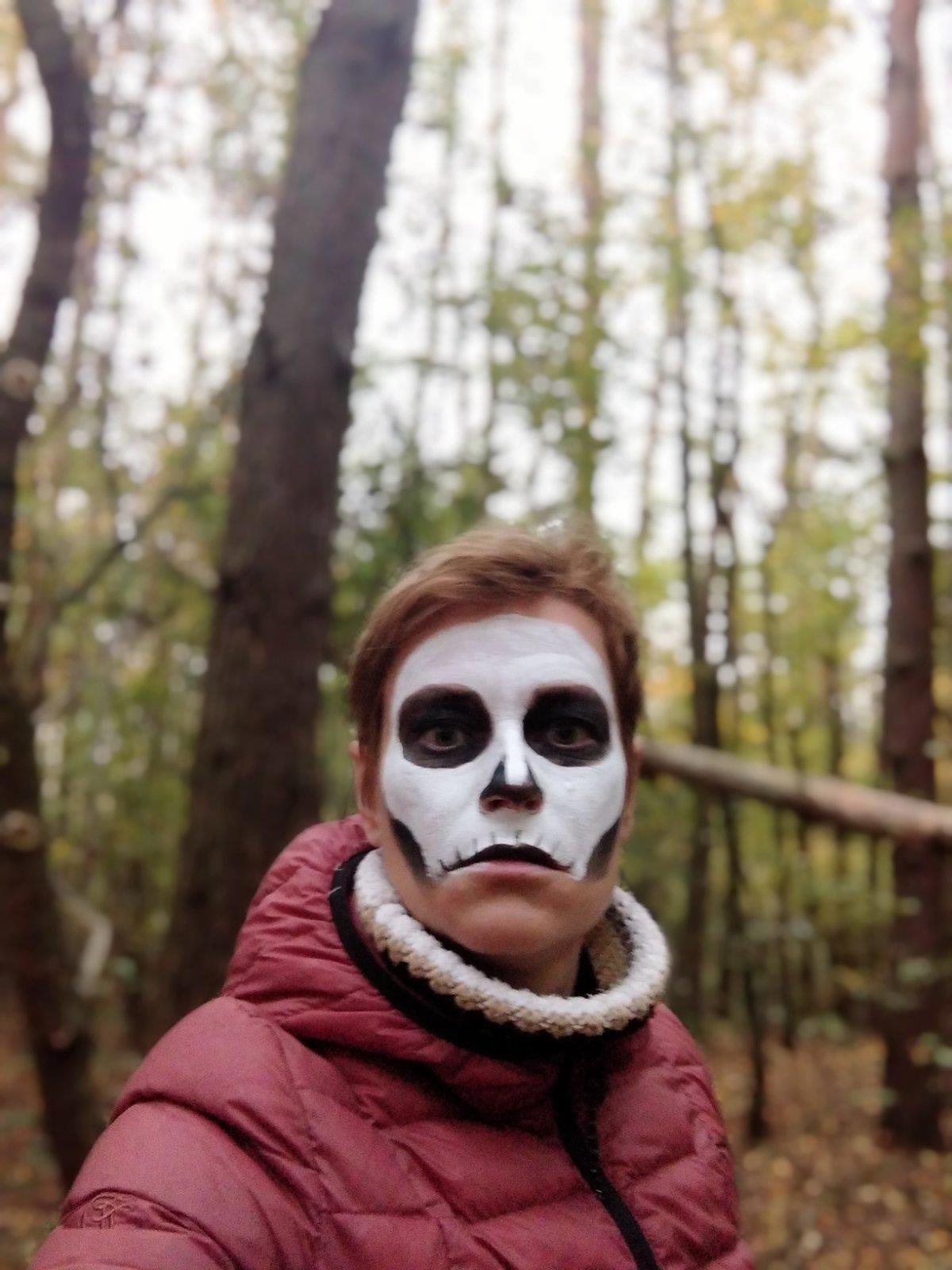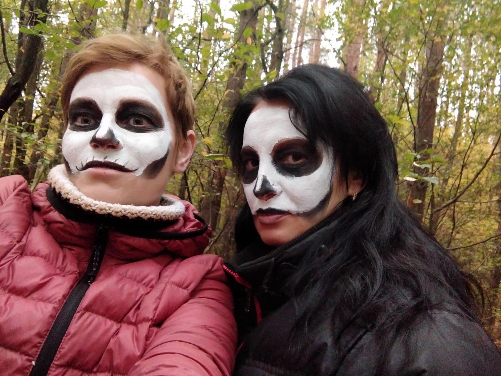 Я дала куме водку и огромную жареную шкварку. Пока кума это всё борола, я быстро привела себя в праздничный вид и приступила к ней. Кума серьёзный человек и вчителиця, вернее, викладач української мови. Она сказала, что Хэллоуин – не славянский праздник, но я процитировала Шевченка – і чужого навчайтесь, і свого не цурайтесь. Она сказала, что её могут увидеть студенты, но я ответила – кума, вы что, с дуба ё@лись? (Мама, папа, кум, кума – всегда только «вы») Где вы тут студентов видите? Тут одни деревья. Слово за слово, я её уболтала и накрасила.